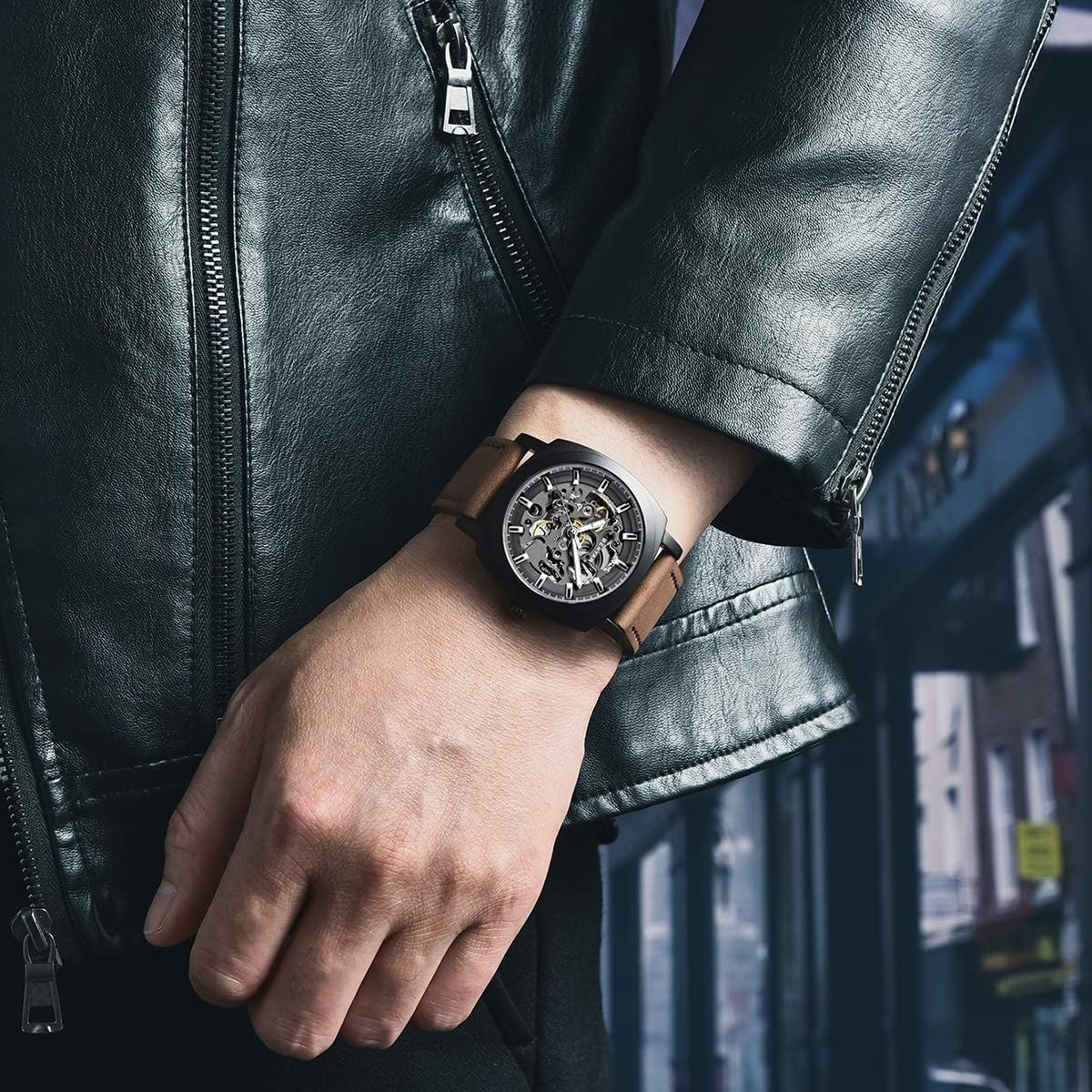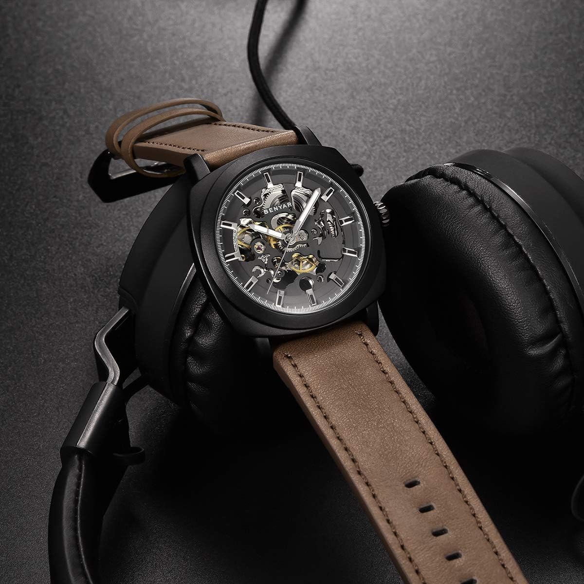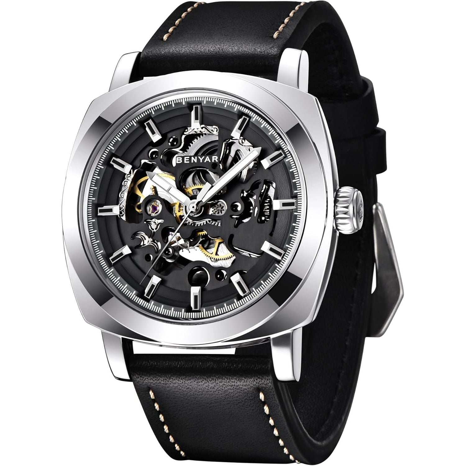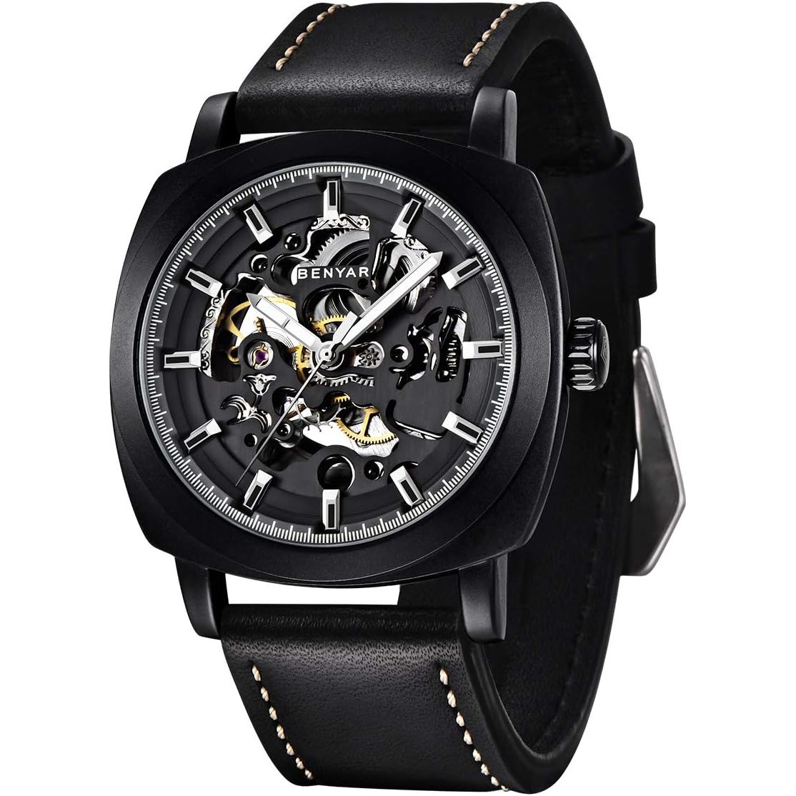 ⌚ ELEGANT DESIGN: BENYAR offers a range of automatic mechanical wristwatches specially designed for men. The watch comes with thick glass and a black skeleton dial. The genuine brown leather strap with a width of 2.4 cm and a length of 22 cm gives the watch an elegant look.