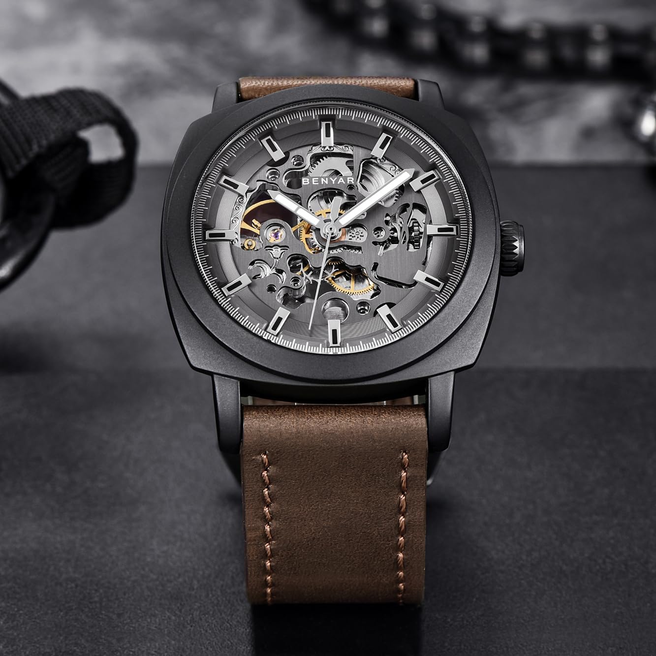 Benyar Automatic Watches for Men | Skeleton Mechanical Leather Strap Mens Watch | 45mm Dial | 30M Waterproof | Men's Stylish Gift