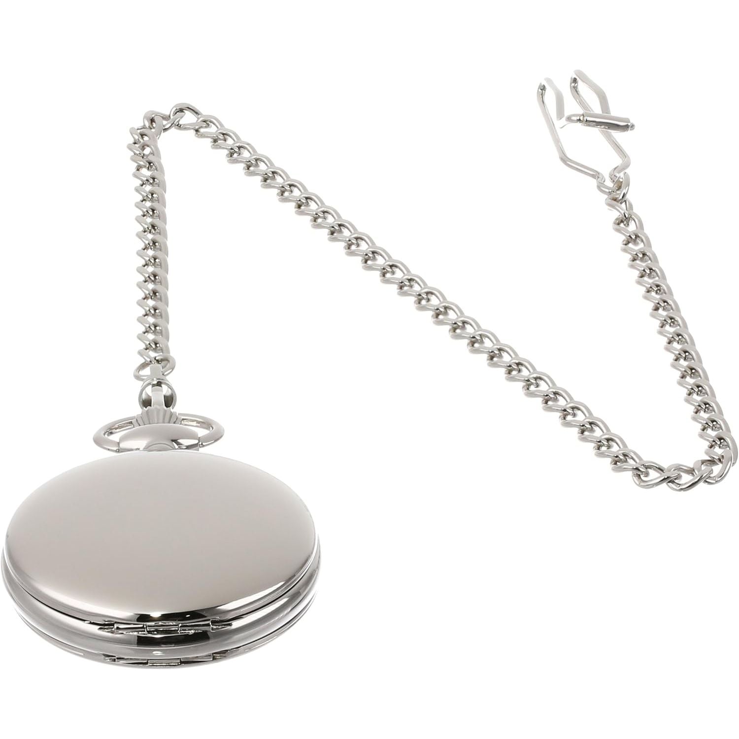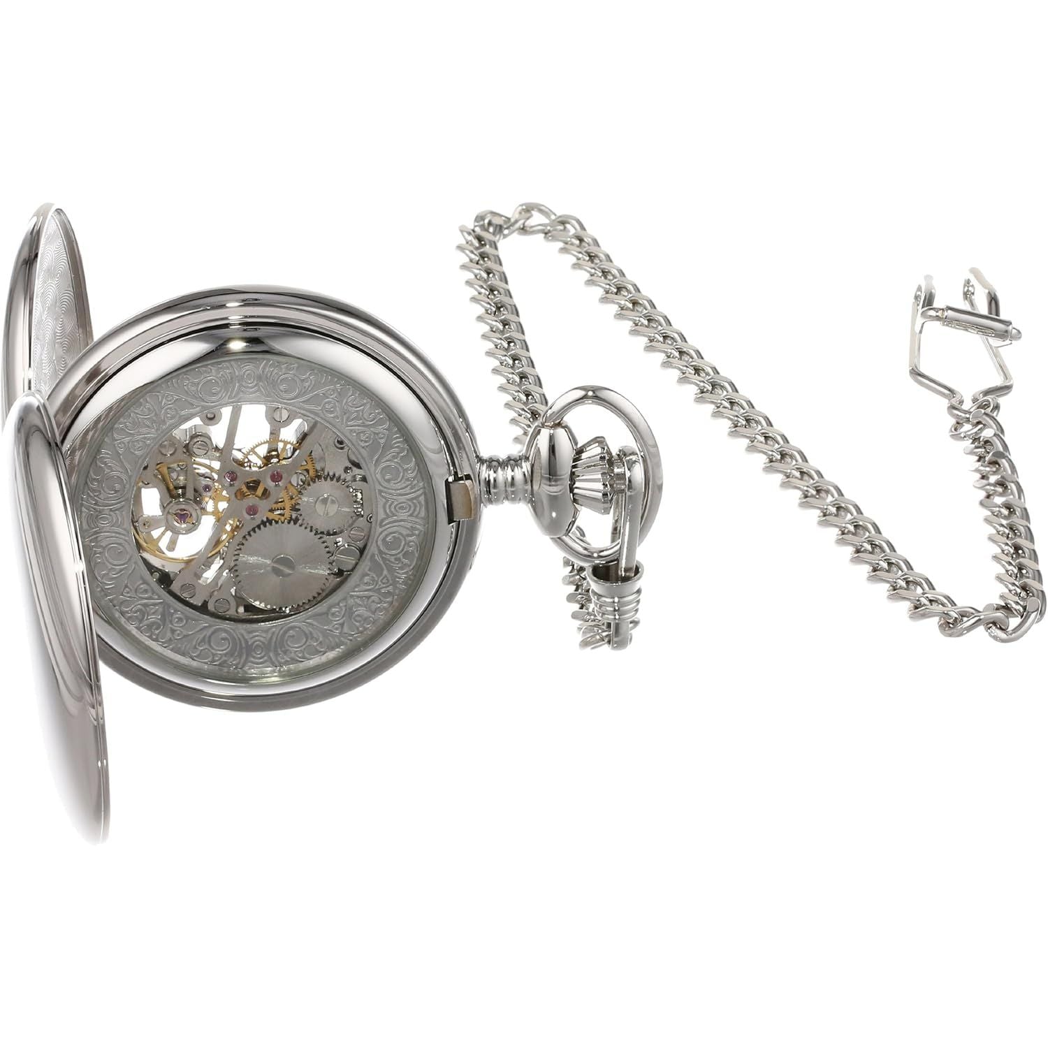 - Chrome finish brass 47mm double hunter case with a matching curb chain