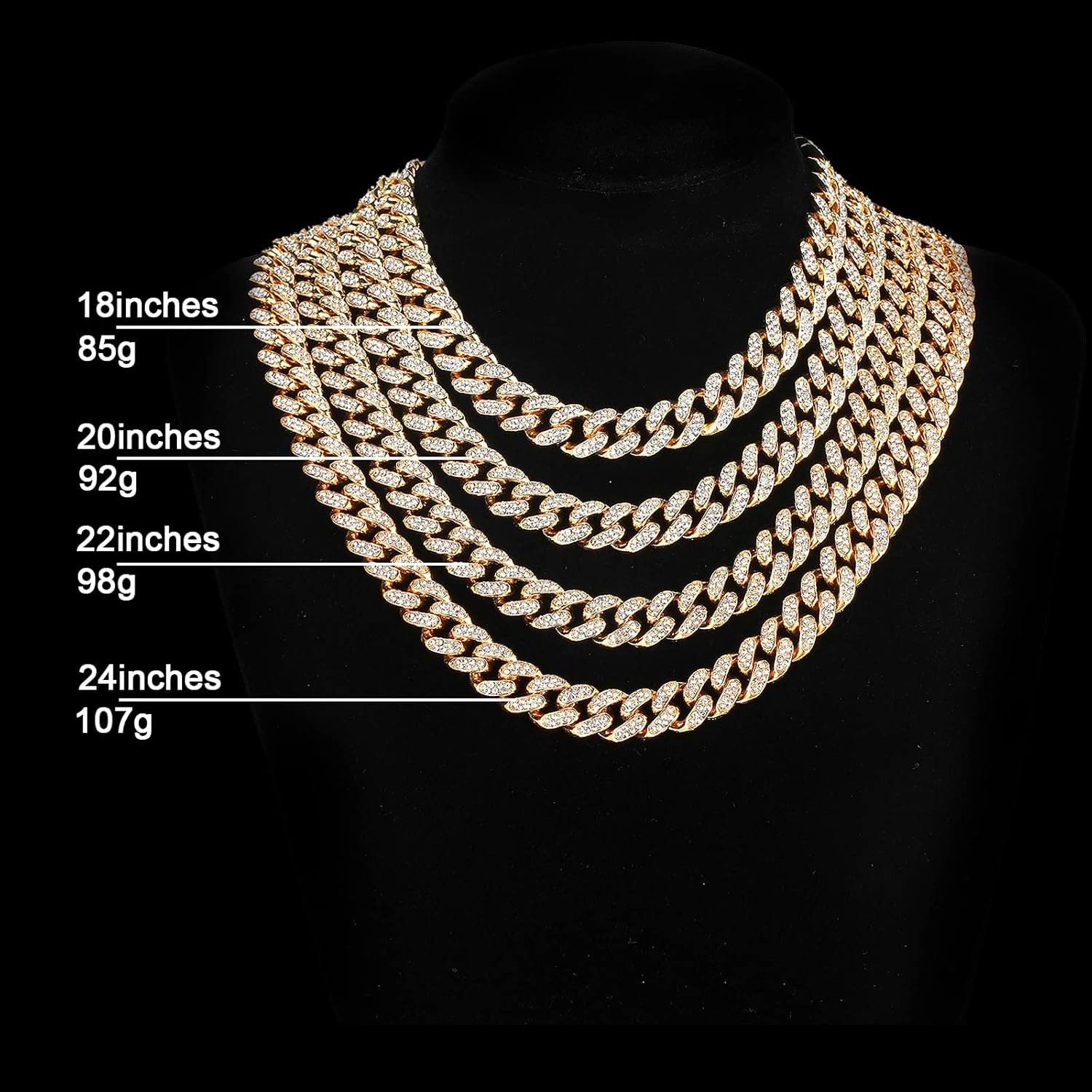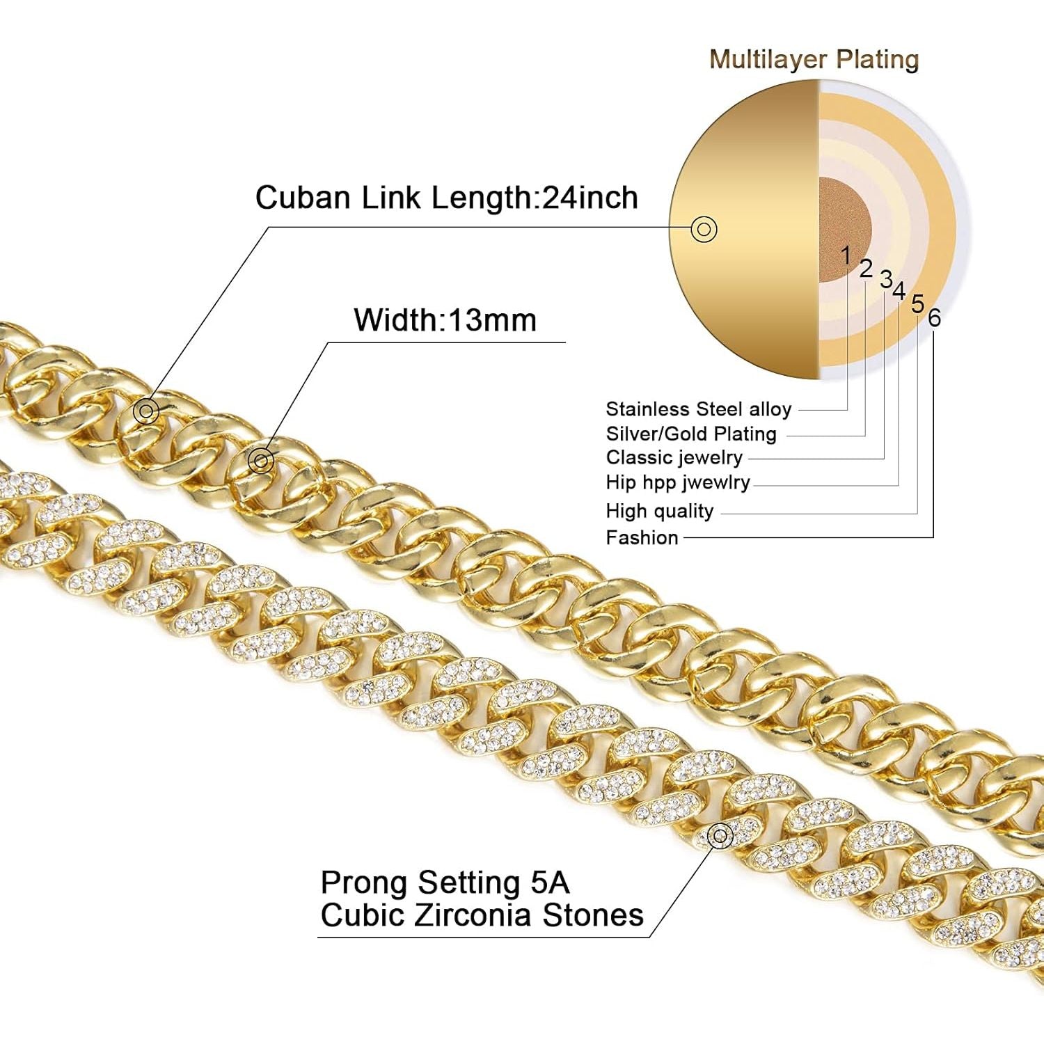 - Cuban Chain Necklace Size - 18inch, 20inch, 22inch, 24inch,Chain width: 13mm, everybody size is different, we suggest you tie a string and measure it,so that you can choose a perfect size for you.