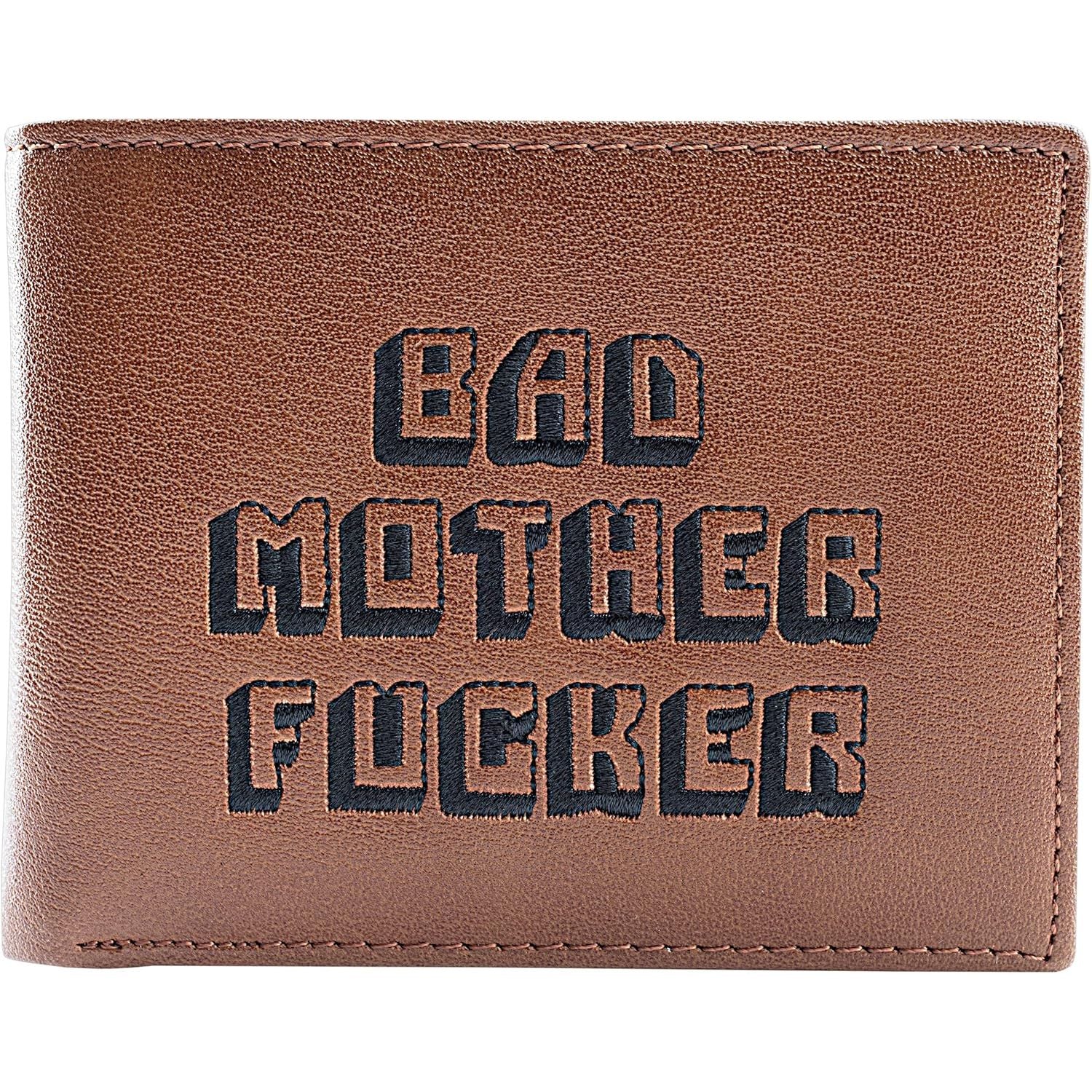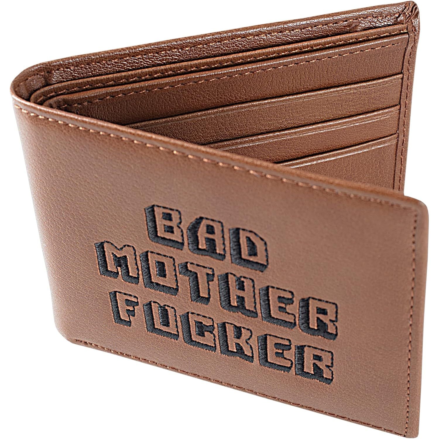 The officially licensed Bad Mother Wallet by Miramax, LLC. A wonderful momento from the movie Pulp Fiction, that is sure to bring compliments anytime it's pulled out. The bi-fold wallet is embroidered, and is made from a grade of leather defined as genuine leather. Genuine leather is made from the leftover of leather after the high-end products are made. Products manufacturered from genuine leather do not look or feel as pleasing compared to those made from high-quality leather. Likewise, products made from genuine leather do not last as long before they wear out. However, most fans of the movie love the wallet, and find that it is a great balance between value and quality. Taken care of properly, the wallet can last for years. Includes Jules novelty insert. Size: 4.5 in x 3.5 in. (114mm x 89mm)