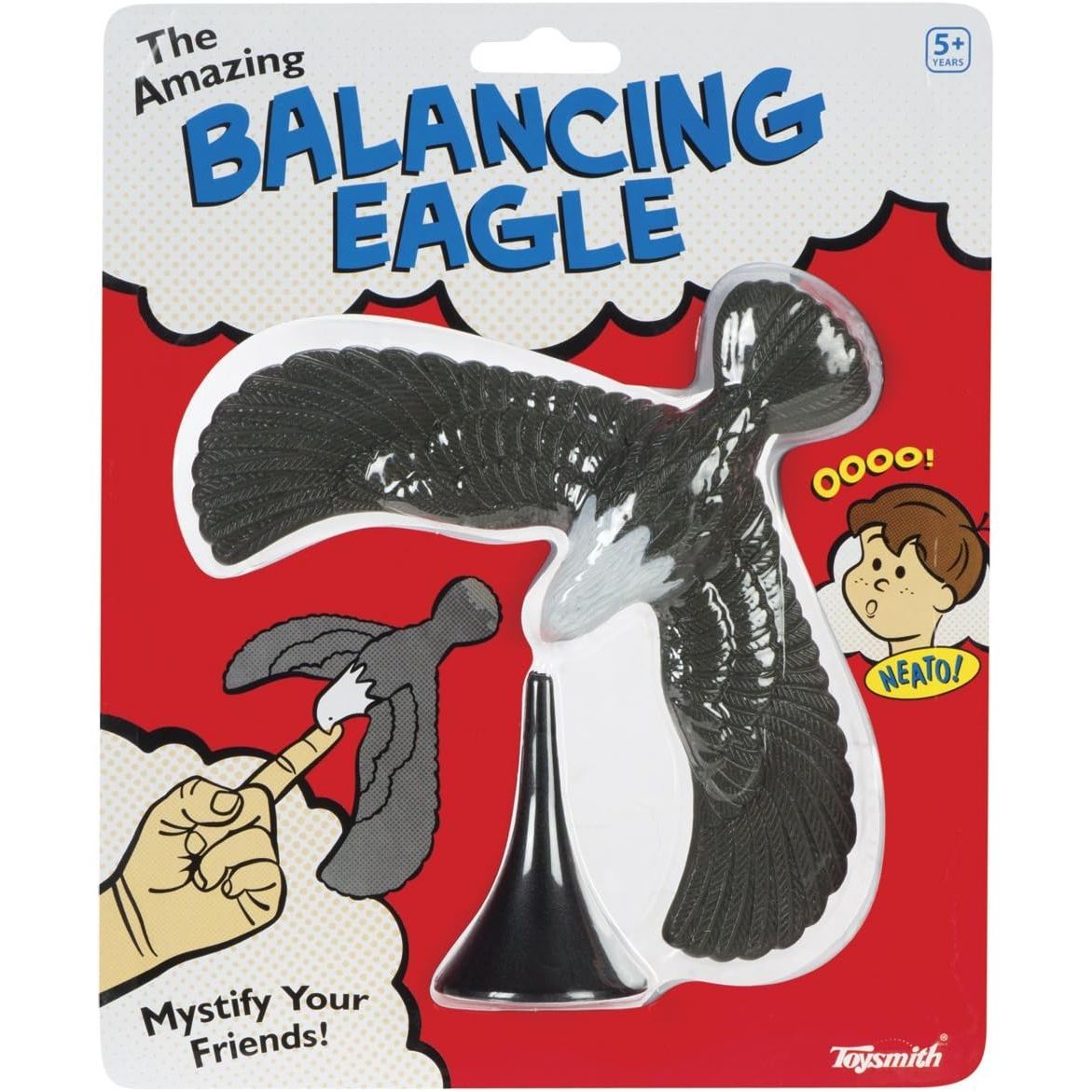 Product Description Perform amazing feats of balance with the Toysmith Balancing Eagle. This perfectly weighted toy eagle balances perfectly on the tip of its beak. Rest it on its stand or the tip of a finger and mystify friends with a gravity-defying balancing act. Spin it, stop it, flip its wings - the eagle won't fall off. The eagle has a 7-inch wingspan and sits on a 2.75-inch stand, perfect for display on a desk or tabletop. Recommended for ages 5 years and up. From the Manufacturer The Balancing 7" Eagle by Toysmith balances on your fingertip by its beak or the included stand. Spin it, tip it's wings this eagle will amaze you and your friends. Ages 5 and up.