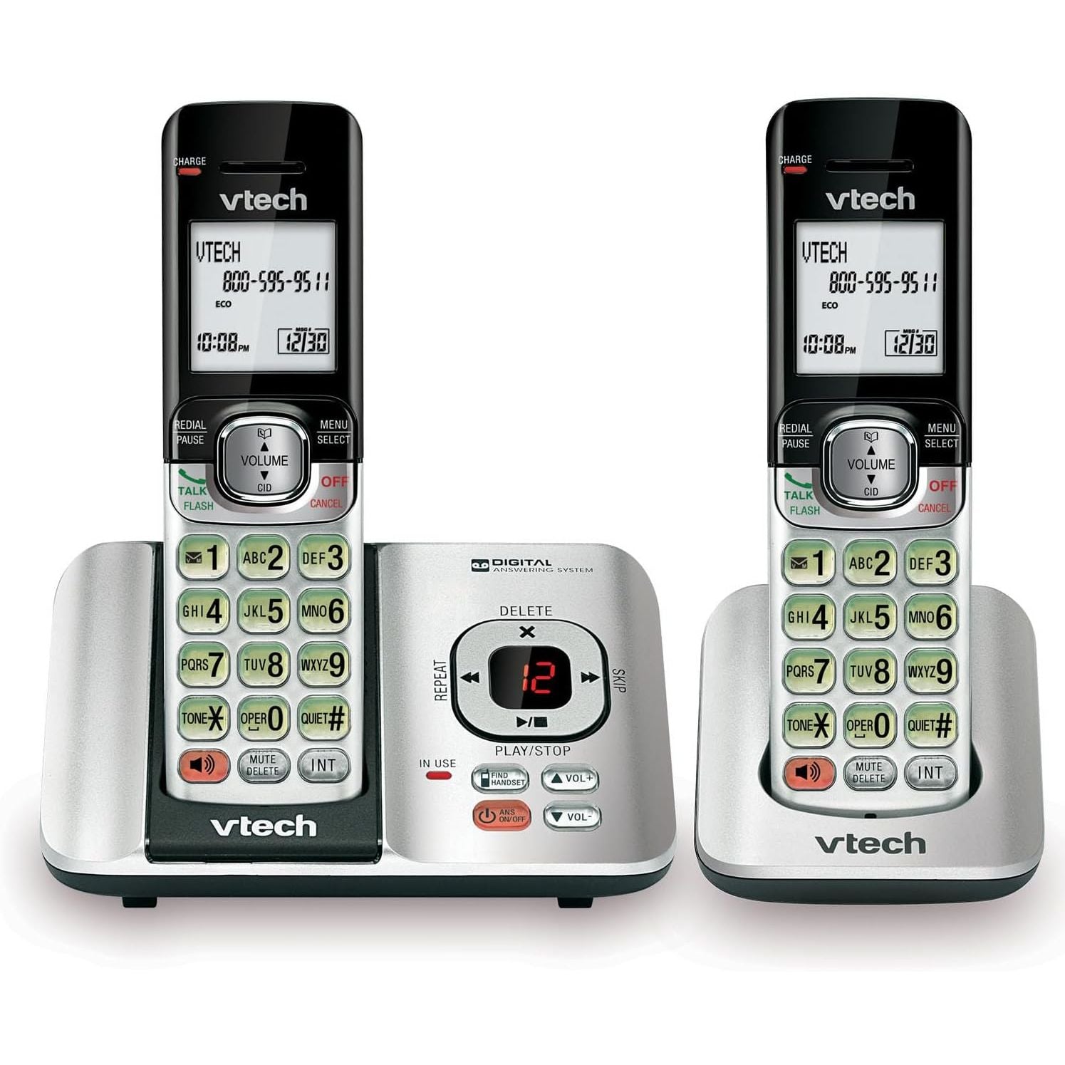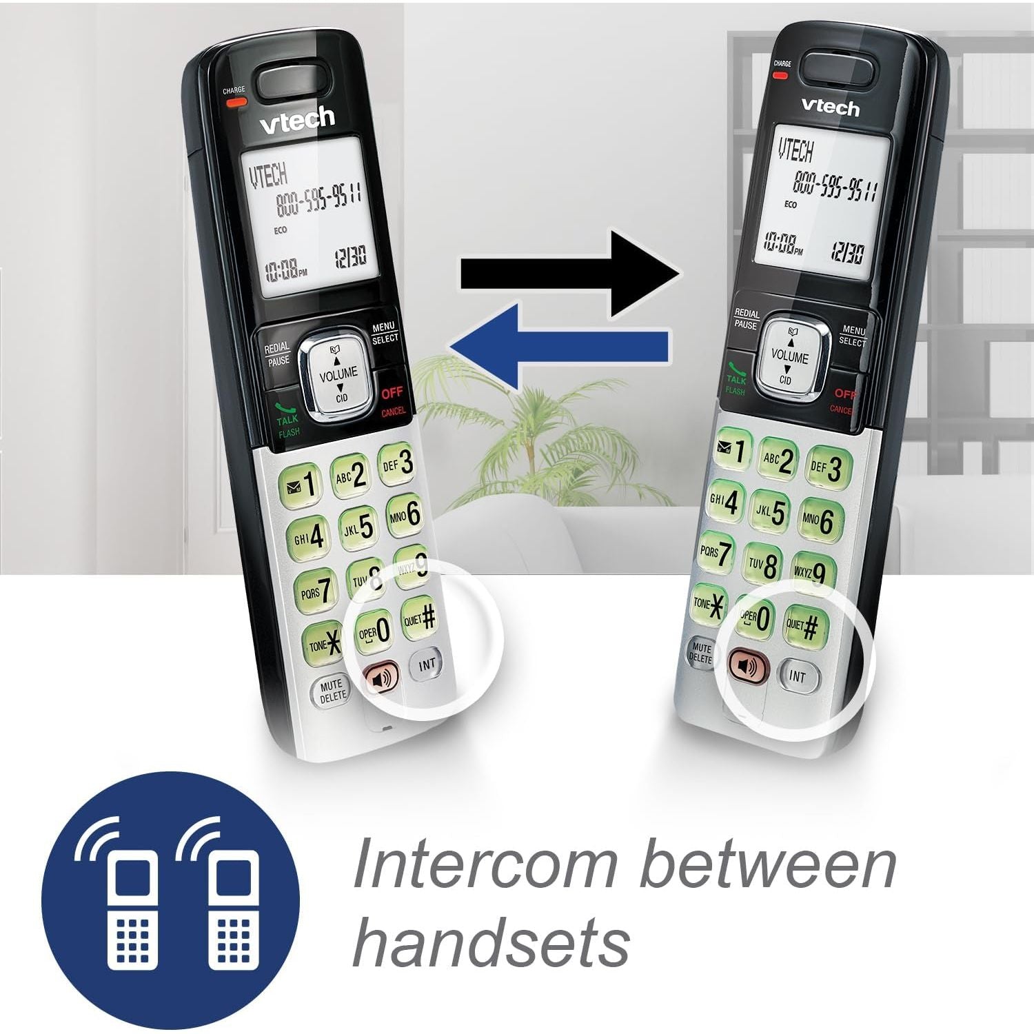 The VTech CS6719-2 Cordless Phone with Caller ID features an expandable system in which you can add up to five additional handsets (uses CS6709). This phone set includes a backlit keypad and display for easy viewing, ECO mode power-conserving technology and a quiet mode that silences the ringer to prevent interruptions. The VTech phone system with call waiting has caller ID, a full duplex handset with speakerphone and an indicator that notifies you of an awaiting voicemail. Handset to Handset Intercom.