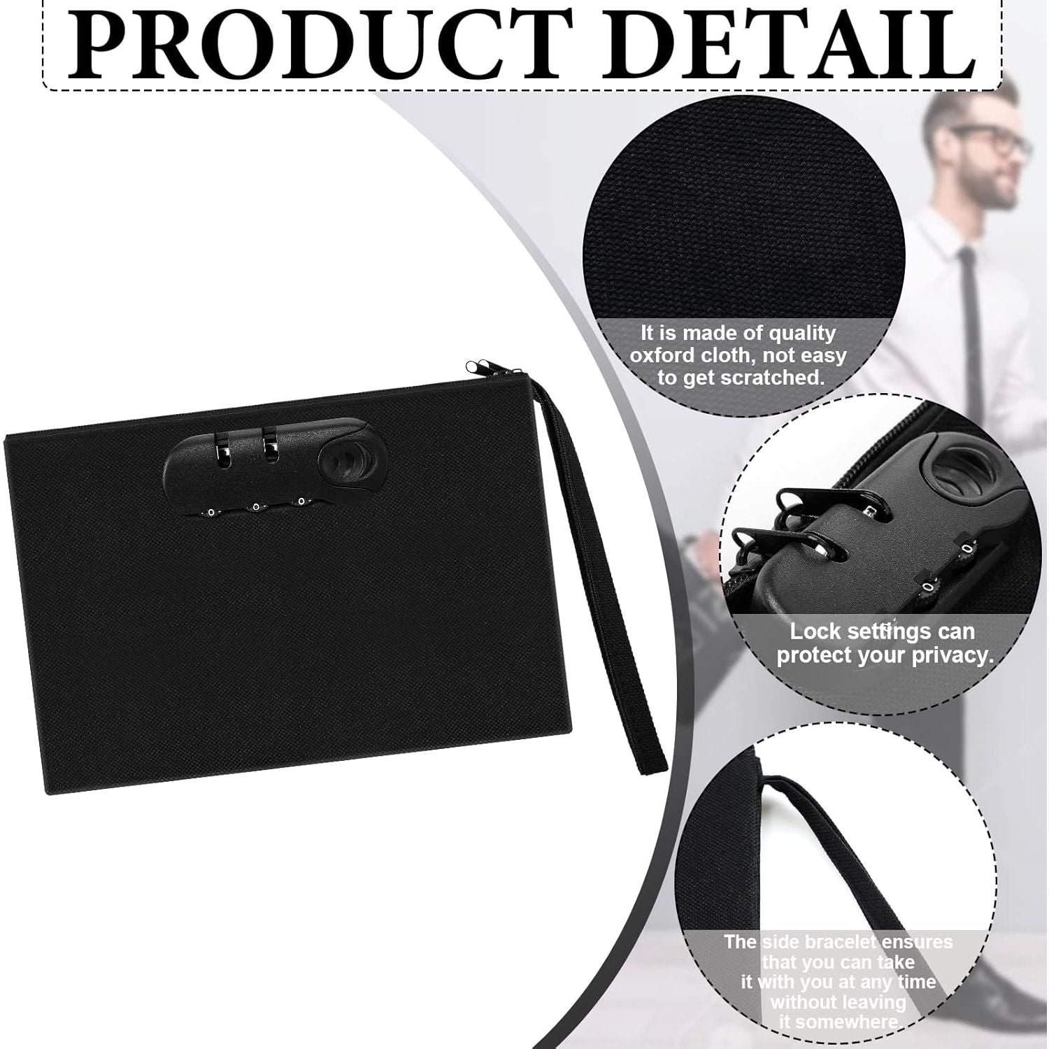 Features: Wide range of application: You need a secure place to hold your house key, this cash bag for cash, deposit supplies, and more will keep your small valuables safe. Function: Our documents bag comes with a zipper and combination lock as an added layer of protection. The bracelet on the side also makes sure you don't lose it somewhere. Specification: Material: oxford cloth Quantity: 2 pieces Color: black Size: 5 x 8 inches Package include: 2 x Bags Note: Manual measurement, please allow slight errors in size.