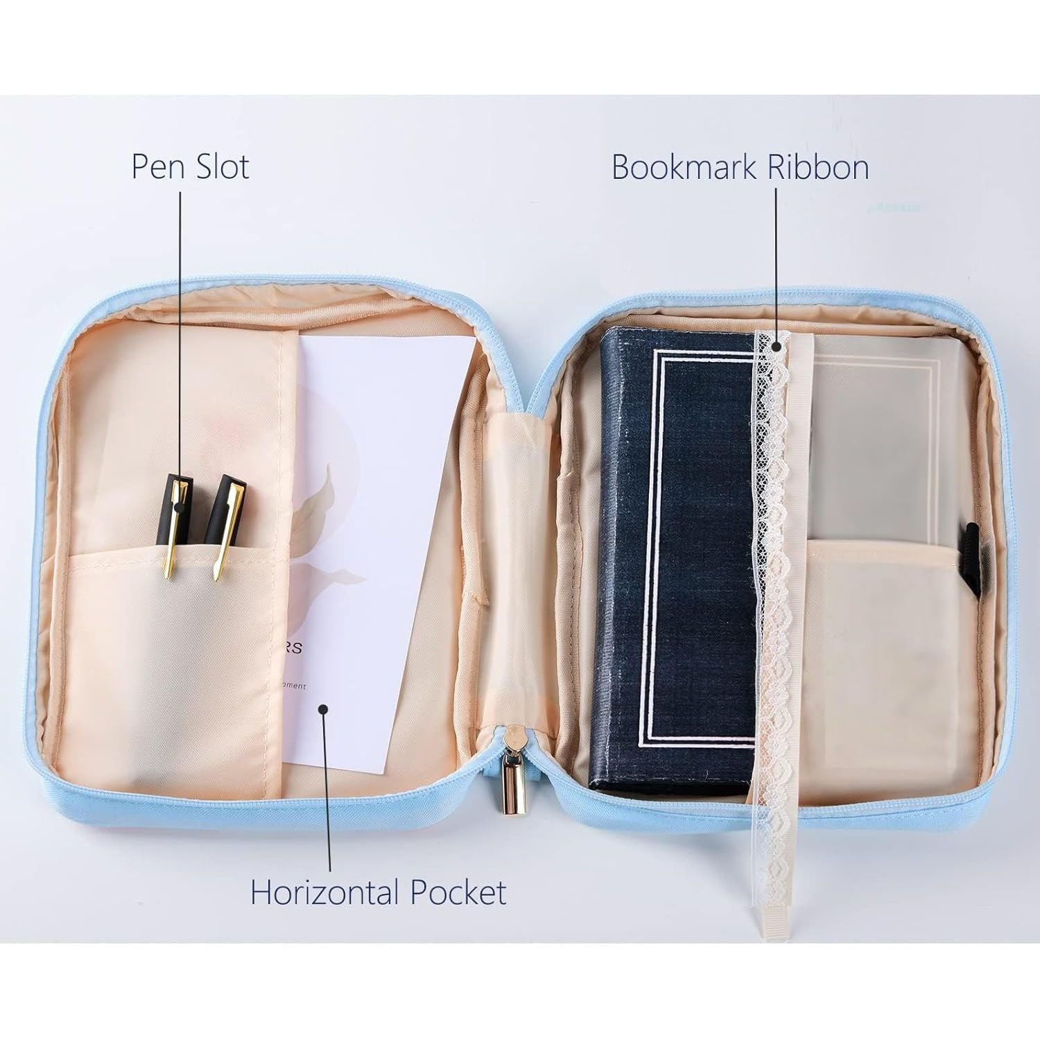 - STRUCTURE AND ORGANIZATION FUNCTION: Convenient carry handle is easy to hold for easy travel to church or Bible study. Interior pockets protect your pens, highlighters, bookmarks, and notebooks, etc. The Interior pen loop secures your pen or highlighter when not in use. The two marking ribbons are convenient and stylish. Simply place them in passages so you know exactly where you left off.