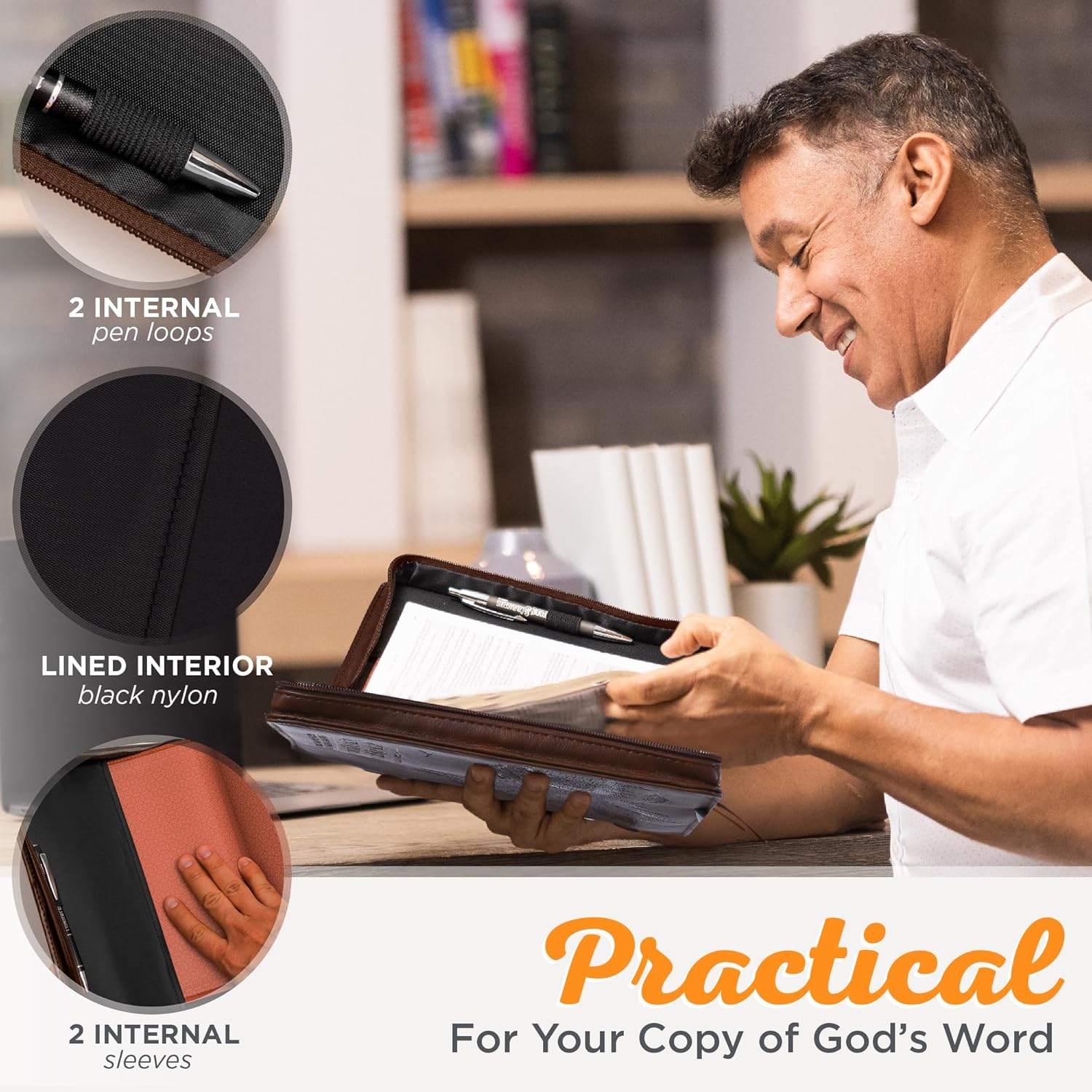 - Ensures your Bible stays clean and safe inside. Exterior slip pocket provides extra space for organization. Slip your loose notes, bulletins, or tissues inside for easy storage.