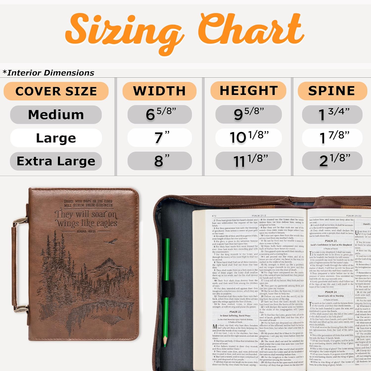 This Bible cover is available in three sizes: medium, large, and extra-large. Please refer to the last image in the image carousel on the left for the Bible Cover Sizing Chart before ordering.