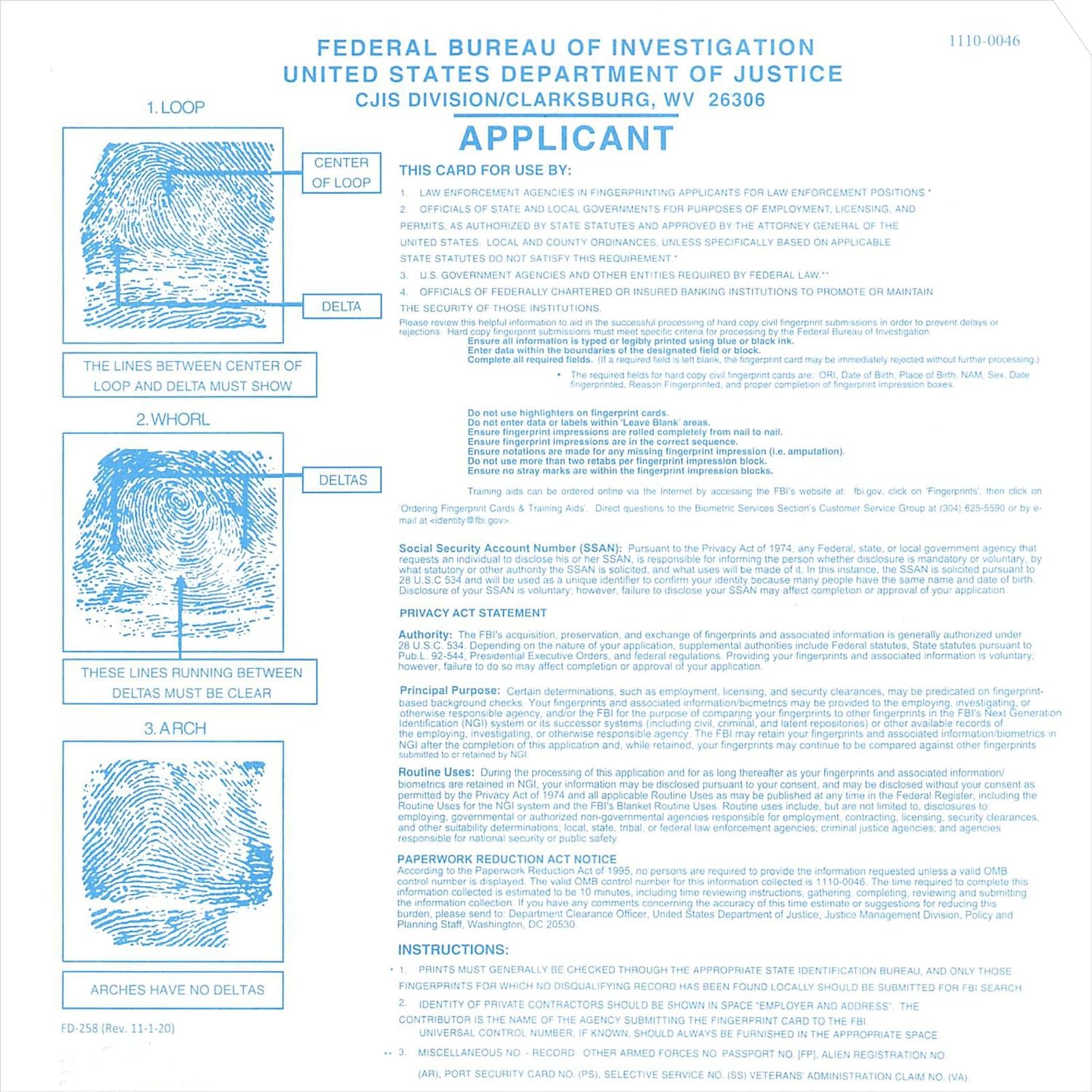 - Bianco con linee blu, Padrão FBI FD-258, FBI ver 5/15/17, Standard FBI FD-258, FBI ver 5/15/17, Estándar FBI FD-258, FBI ver 5/15/17, Fingerprint Cards, Applicant FD-258, 5 cards