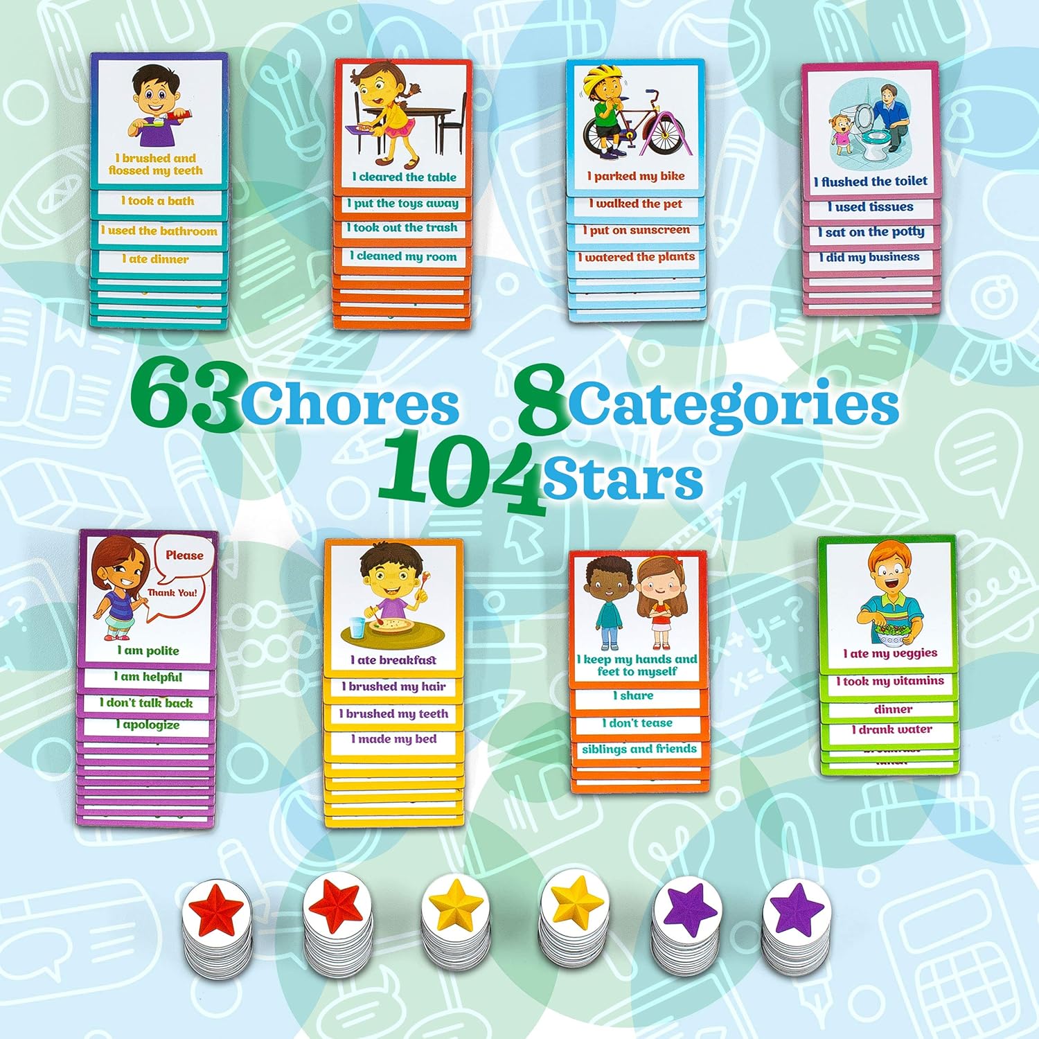 - GREAT MOTIVATIONAL TOOL - There are 6 sets of specific chores: Morning Chores, Bedtime Chores, Household Chores, Healthy Eating, Manners & Potty Training Chores. Check out all 63 chore magnets!