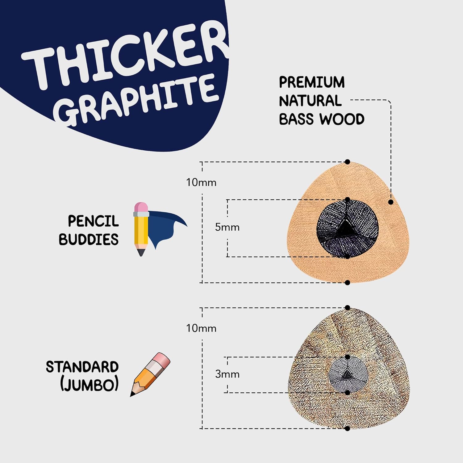 - STRONGER THICKER 5MM FAT GRAPHITE CORE – Rather than the standard 3MM core used in most other jumbo kids pencils, Pencil Buddies utilize a 5MM thicker graphite core that creates a wider tip, which makes it easier to create clear lines or draw without breaking it off with heavier pressure.