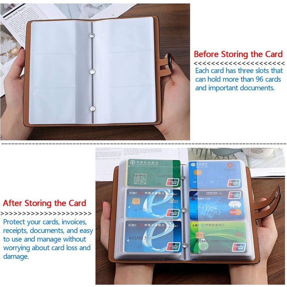 - 【 Large Capacity 】The business card organizer has a total of 32 card pages, each of which can accommodate 3 cards, with a total of 98 card slots, fully meeting your card storage needs. You can use it to save important customers' business cards, credit cards, debit cards, ID cards, membership cards, VIP cards, invoices, receipts, etc.