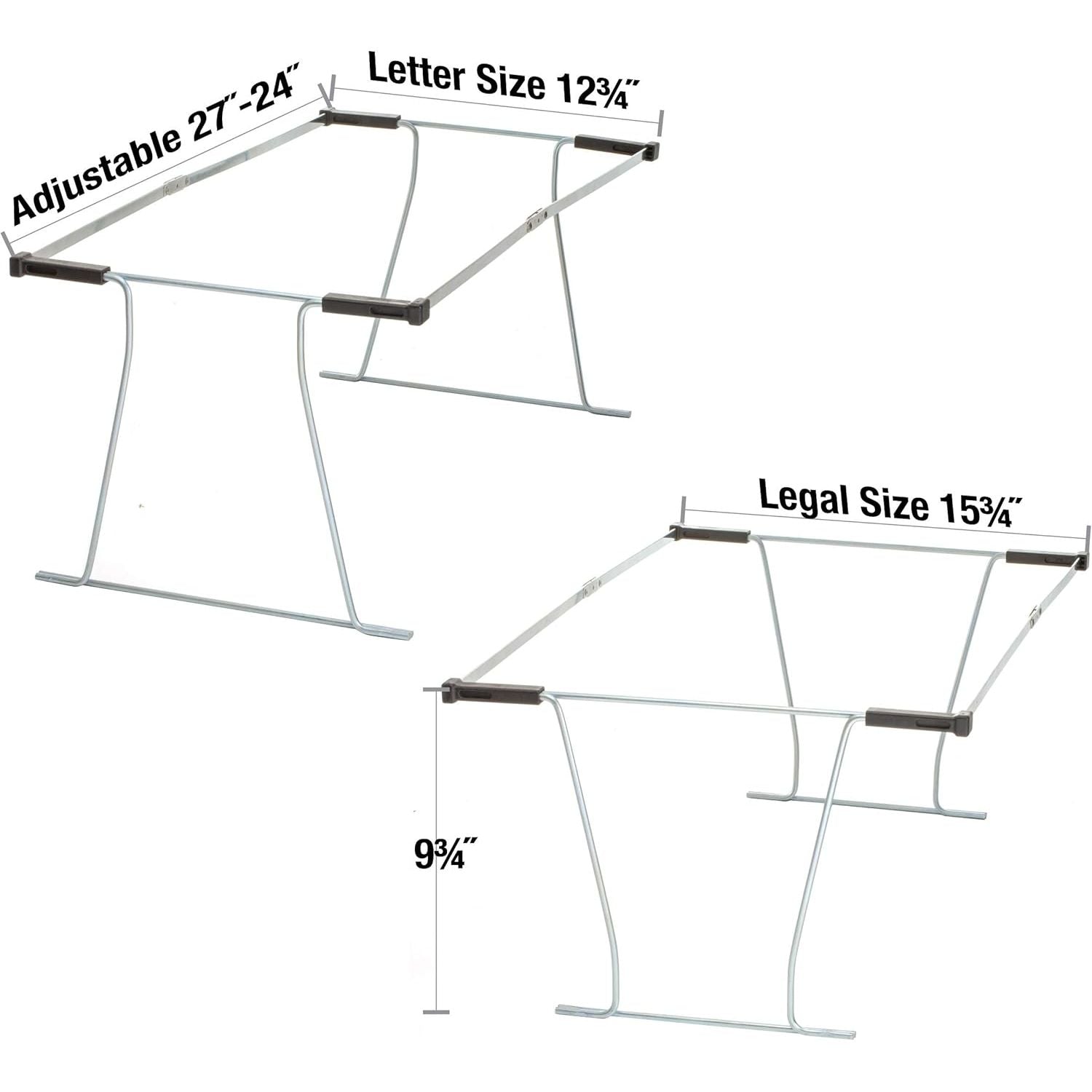 Universal folder frame assembles quickly and easily without tools to hold letter-size or legal-size files. Perfect for any home or office. Fits well in desk cabinets 24 Inches to 27 Inches deep; holds file folders in drawer. Features breakaway notches every 1/2 Inches for adjustment. The rails are 27 Inches but it breaks down every half inch to 24 inches. Features heavy duty coated steel construction. 12 Inches x 27 Inches x 9 Inches. Packaging: 12. 6" x 9. 9" x 1. 1"
