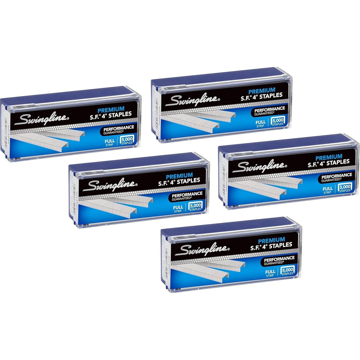 Swingline S.F. 4 Premium Staples provide strength and durability for dependable stapling. Tests show 75% fewer failed staple jobs than comparable staples. These staples have proven greater performance – they’re made with 135,000 PSI premium grade wire for greater tensile strength. Designed with precision-engineered chisel points that penetrate papers easily, preventing jams and other stapling disruptions. Staples with ¼” leg length can comfortably fasten up to 25 sheets of paper, making them a perfect choice for most projects and presentations. A full strip contains 210 staples. The convenient, reusable storage box contains 5,000 staples, allowing for long-term productivity with fewer re-orders. Includes two boxes. Sturdy staples are compatible with most standard size staplers.