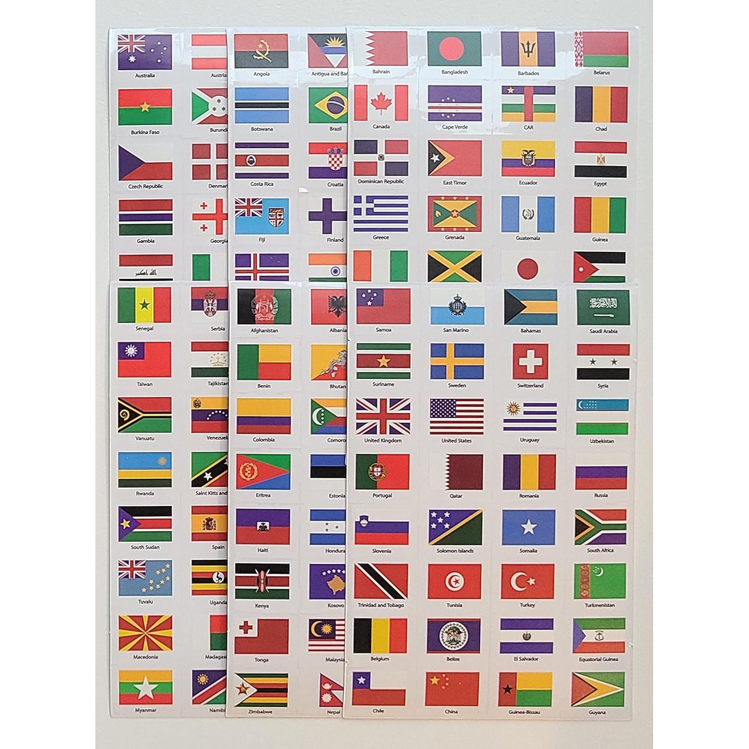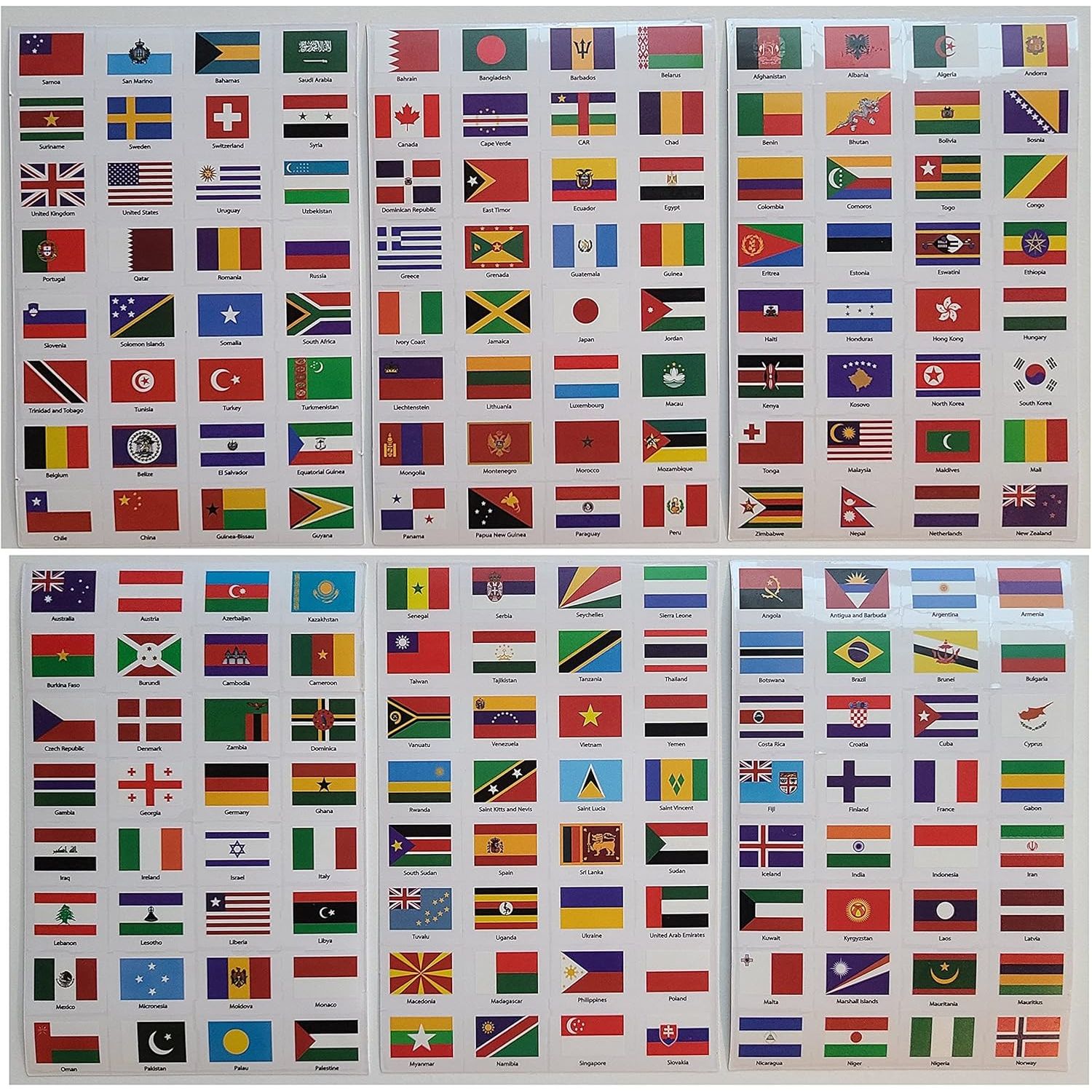 Quantity & Style: You will get 6 Sheets of Country Flag Stickers with 32 Flags on each Sticker Page! There is a total of 192 Country Flag Stickers. (This set of stickers contains only independent status countries.