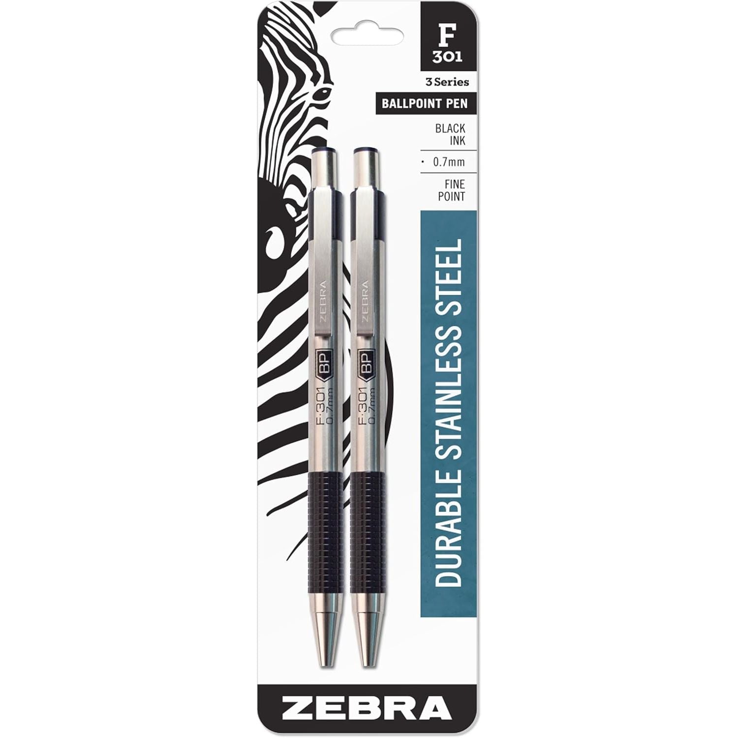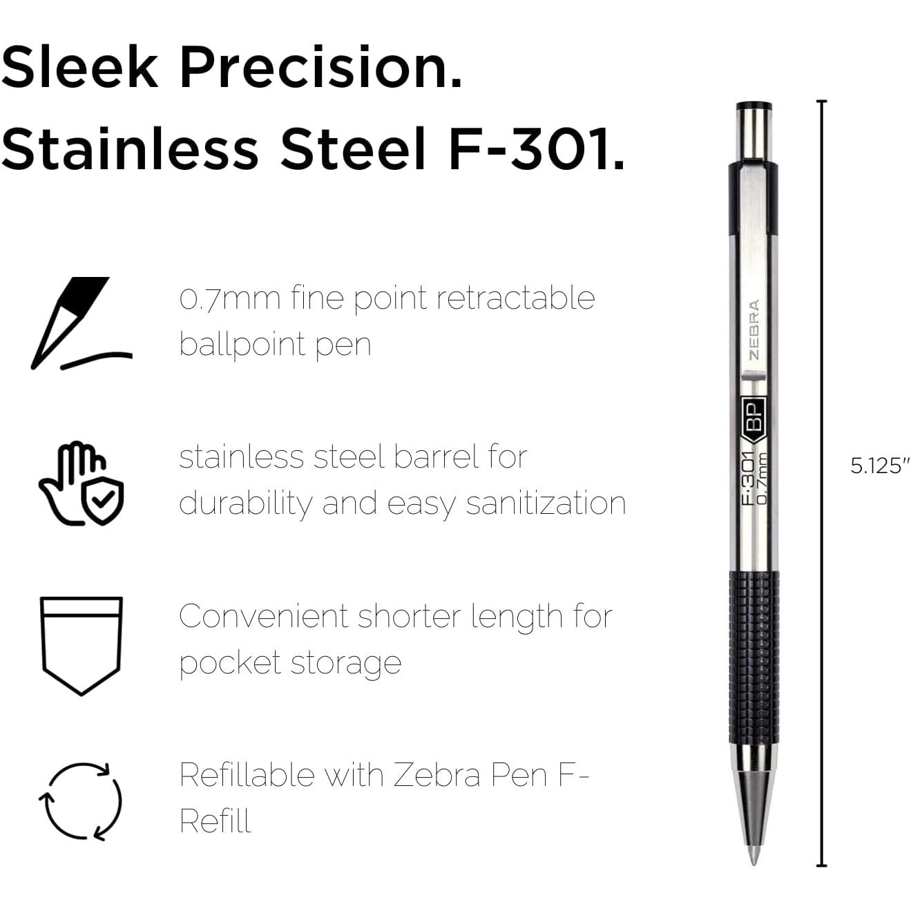 - Zebra Pen F-301 Ballpoint Fine Point 0.7mm Stainless Steel Retractable Ballpoint 2-Pack – Easy-Glide Ink, Non-Slip Grip, Metal Clip, Refillable with F-Refill, Professional Design (27112)