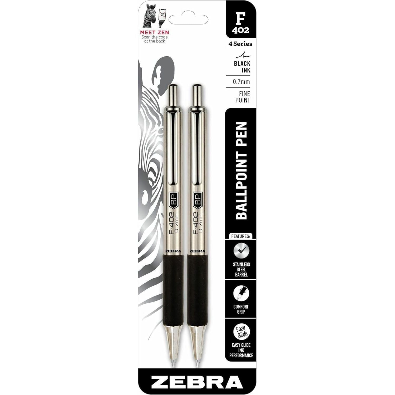 - Zebra Pen F-402 Stainless Steel Retractable Ballpoint Ink Pens 2-Pack, Black Ink, 0.7mm Fine Point, Easy-Glide Ink, Non-Slip Grip, Metal Clip, Refillable With F-Refill (29212)