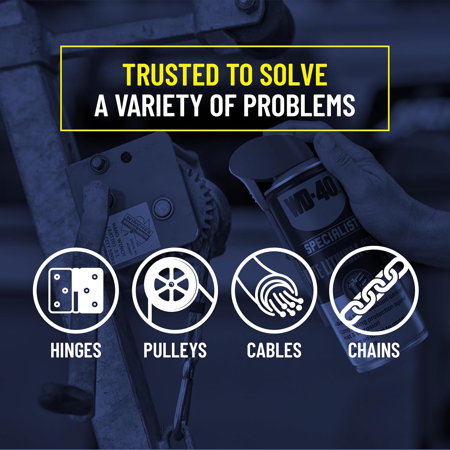 An aerosol grease that sprays on evenly as a liquid and sets dry for a thick protective coating that won't run off. WD-40 Specialist White Lithium Grease is ideal for metal-to-metal applications that require heavy-duty lubrication and leaves behind a rust-inhibiting barrier for protection against corrosion. This long-lasting formula won't melt, freeze, or run in harsh weather conditions. Also great for lubricating equipment before placing in storage. Sprays on easily with a thick, protective coating for outdoor and automotive hinges, gears, sprockets, latches, door tracks, pulleys, cables and guide rails. Safe to use on metals. Effective in temperatures ranging from 0° F to 300° F for unbeatable protection. - Long-lasting lubrication and protection - Lubricates 8x longer than the competition for less frequent reapplication* - Withstands 1.5x more pressure than the competition for less frequent reapplications and reduced downtime** - 50-state VOC compliant - NSF Category H2 (#146864) *Test Lab: Petro-Lubricant Laboratories Inc. (Lafayette, NJ); ASTM D5620A; Test date: 04/2020 **Test Lab: WD-40 Co. Technical Center (Pine Brook, NJ); ASTM D3233A; Test date: 12/2020