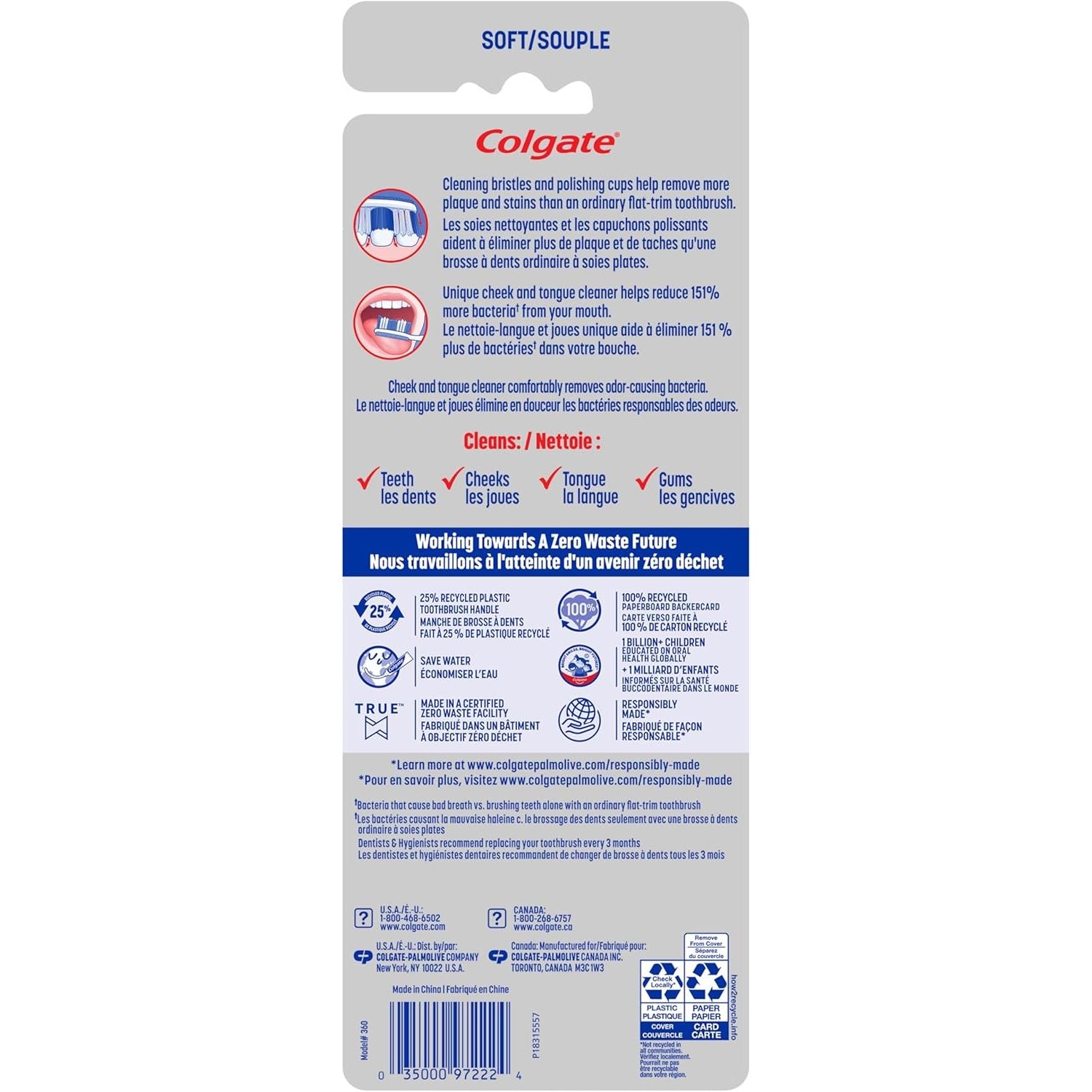 - Unique cheek and tongue cleaner on the reverse side of this soft toothbrush helps remove odor-causing bacteria