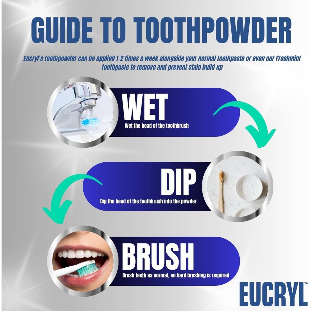 Combine all the power of original Eucryl Tooth powder with the clean lively zing of fresh mint and you have Eucryl Tooth powder Fresh mint. No hard brushing is required to set the fine powder's natural abrasive into action. Eucryl Tooth powder Fresh mint's unique polishing action tackles tobacco, tea, coffee and even red wine stains head on and leaves your teeth looking clean, smooth and bright and your mouth tasting minty fresh. Directions Wet toothbrush and shake off surplus water. Press into powder. Brush your teeth in the way your dentist recommends. For powerful stain removal it's only necessary to use Eucryl Tooth powder once or twice a week in addition to your usual toothpaste. Avoid use on damaged teeth. Always replace the lid and press firmly to close to preserve freshness. Not recommended for children.