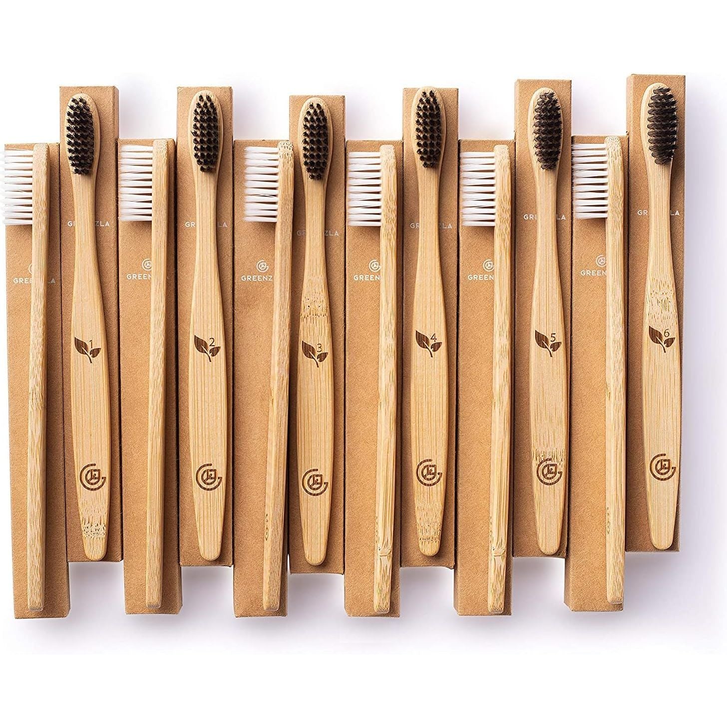 Greenzla Bamboo Toothbrushes for Adults – 12 Pack Wooden Toothbrush Set with Charcoal-Infused Soft Bristles, Natural Oral Care for Daily Use