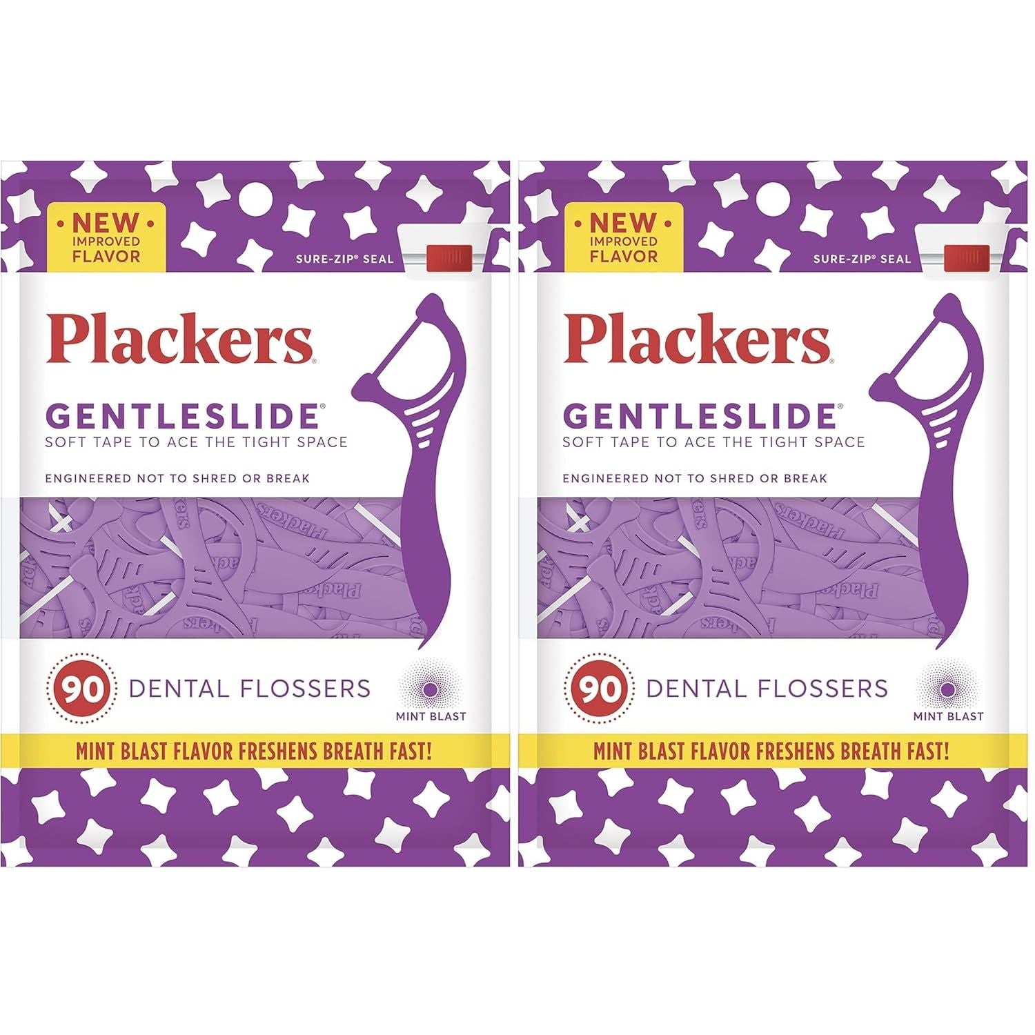 When it comes to tight teeth, Plackers Gentleslide Dental Flossers make it easy to clean in between where ordinary flossers can't. With its Hi-Performance PTFE fiber that slides smoothly between tight teeth and unique design that optimizes pullout strength, our flossers will keep you smiling bright. Featuring a built-in pick to help remove plaque and trapped food debris between teeth. The unique handle design provides more control and comfort while cleaning between your teeth and gums. Rely on Plackers to Get the Gunk Out. Enjoy a delicious mint blast flavor that freshens breath fast and leaves your mouth with that fresh, clean feel. Includes 90 dental flossers and sure-zip seal for easy storage for at home or on-the-go. Smile Like Everyone's Watching.