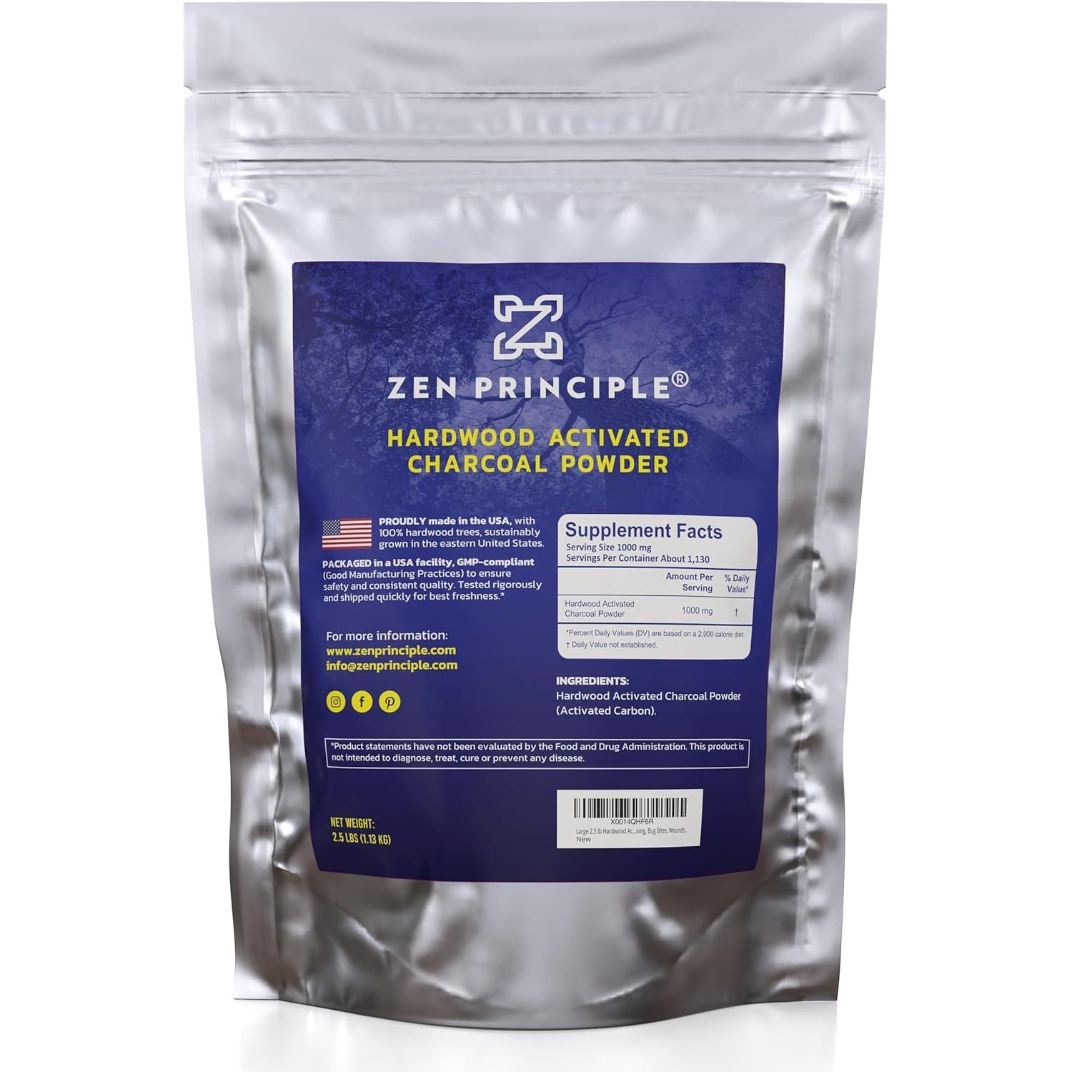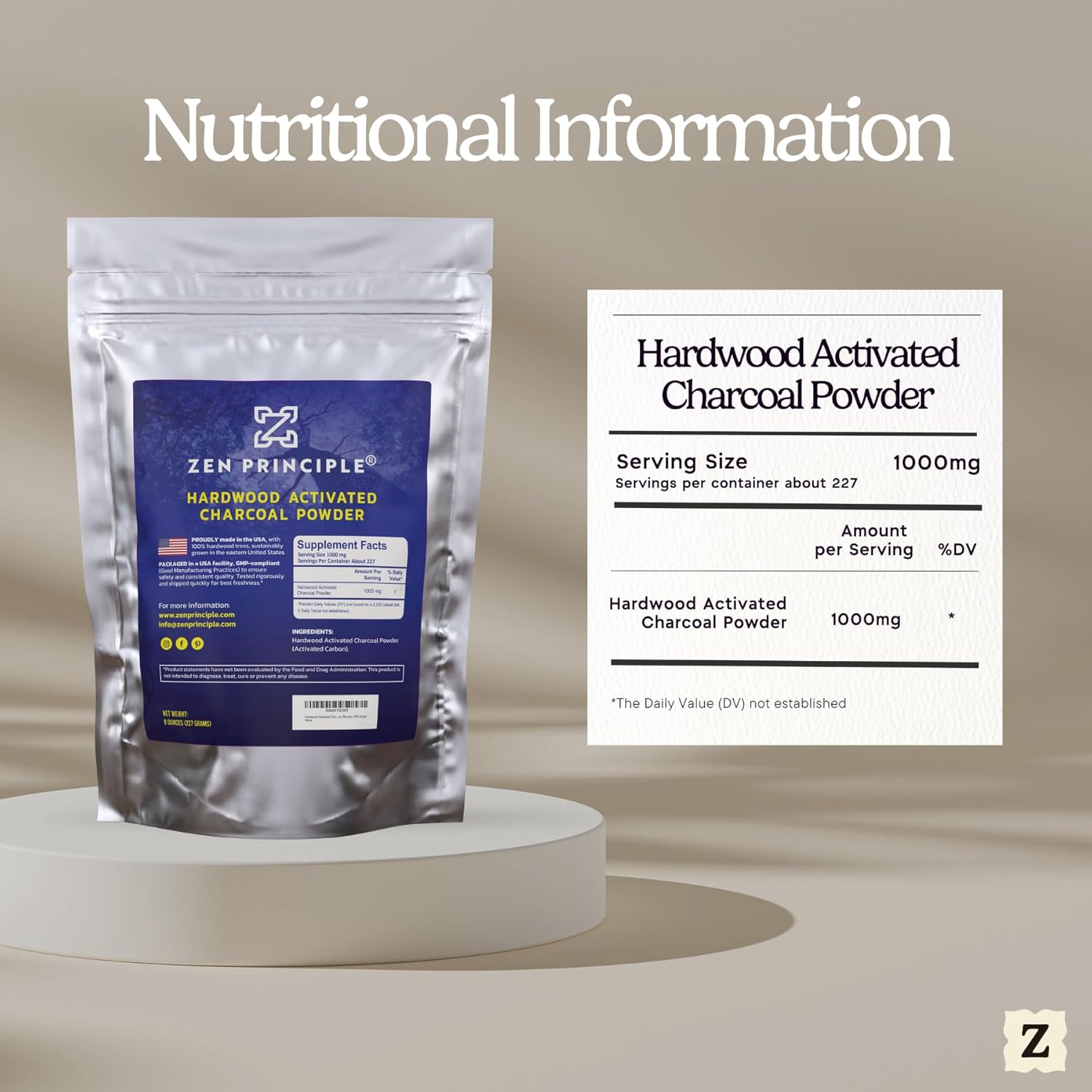 Zen Principle Hardwood Activated Charcoal Powder 100 Percent from USA Trees. All Natural. Whitens Teeth, Rejuvenates Skin and Hair, Supports Better Digestion, 8 oz.