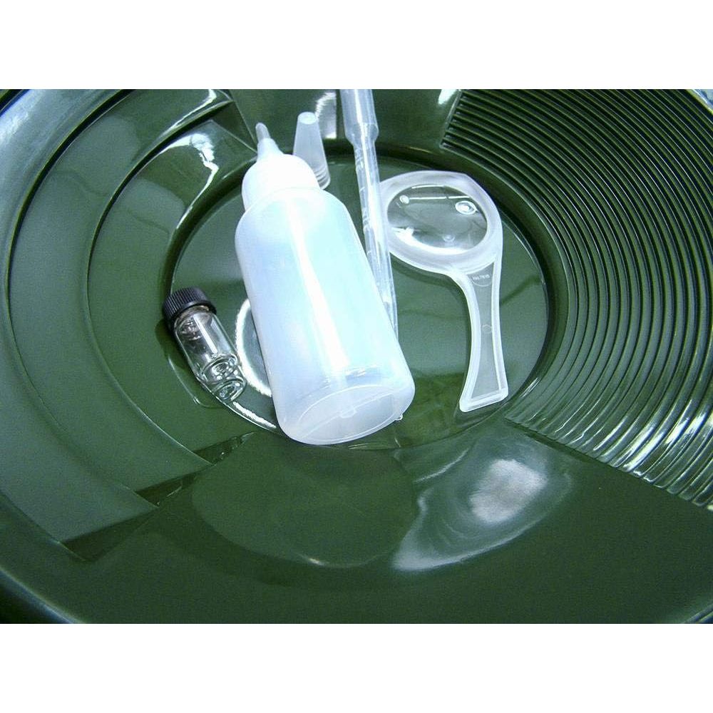 You will receive 1 Gold pan, 1 Snuffer Bottle & 1 Gold Vial, Plus, you will receive a Magnifier & Bubble snuffer. The Gold pans are made of plastic and measure 12" across with deep riffles on one side and small riffles on the other side to make a perfect combination pan. Also has a hole in the edge of the pan to hang it or tie it to your belt or backpack for travel. The bottle is 5" tall with the travel cap on it. This is a great Sniffer bottle with a seal between the cap and bottle that the suction tube goes thru to insure the best suction possible. Please look down at the photo that shows all the parts to these bottles. I think you will be impressed. Plus, you will receive a Magnifier (Style may vary) & Bubble snuffer.