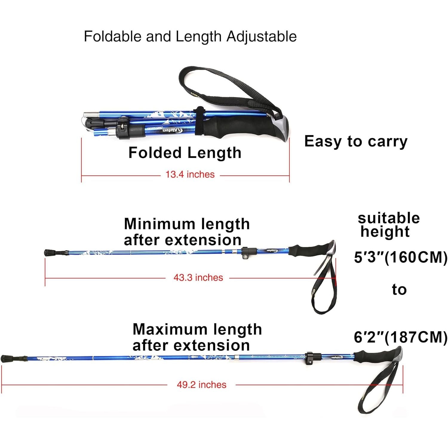 - SUPER COMFORTABLE:EVA Foam Handle with wrist strap, sweat-absorbent, skid resistance groove design,and super comfortable for long time use.International Standard Length of 49.2" long, and 13.4" when folded, fitting perfectly in your backpack