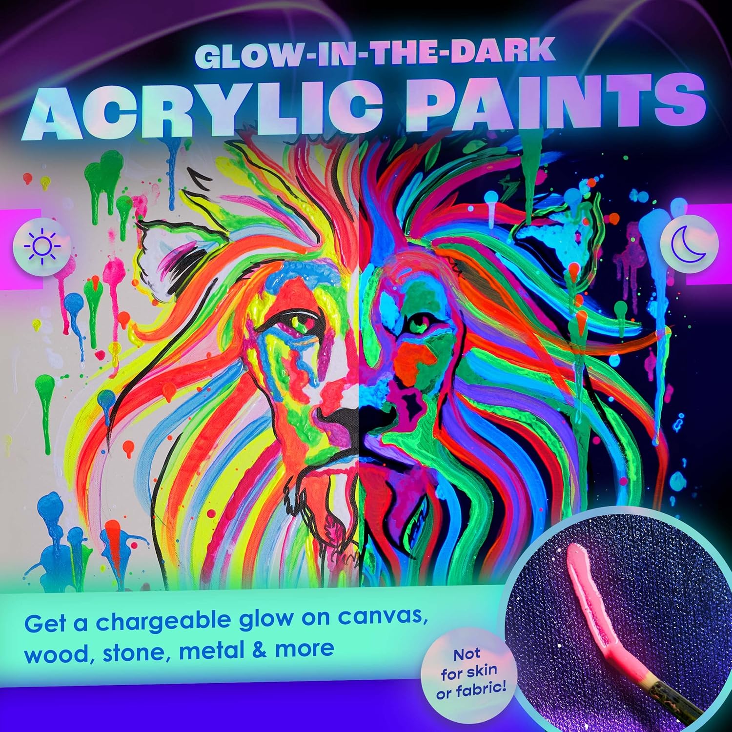 - VIBRANT COLOR: Each glow in the dark acrylic paint set includes eight 20 mL (0.7 fl oz) bottles of red, orange, yellow, green, blue, purple, pink, and white pigments.