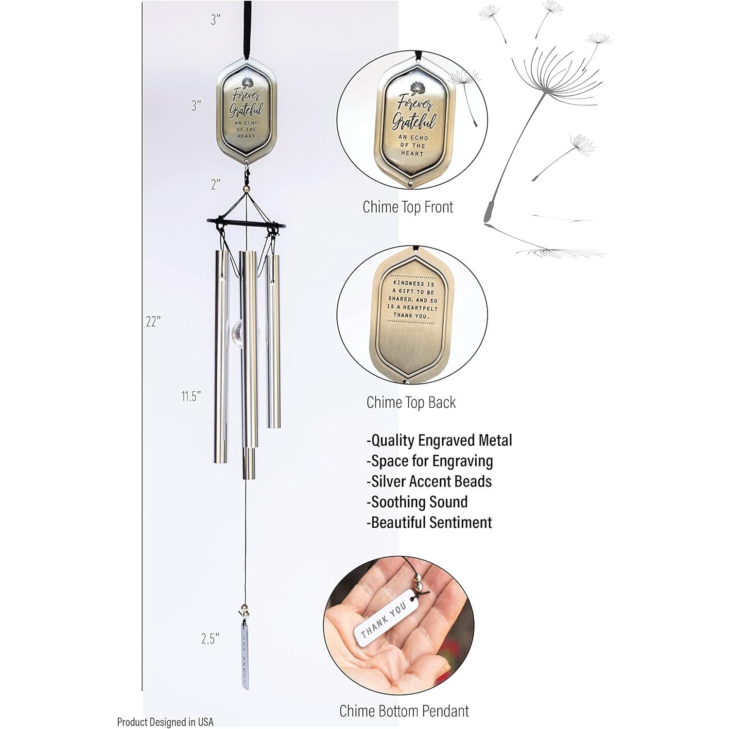 - 22 inch, high quality metal wind chime has silver accent beads & clear crystal ball, and comes gift boxed with "Forever Grateful" message (copyright Teri Harrison). The special thank you message is printed on an 8.25x2.5 inch card to show your appreciation for a big or small gesture that touched your life. Thoughtful thank you gift for special friend