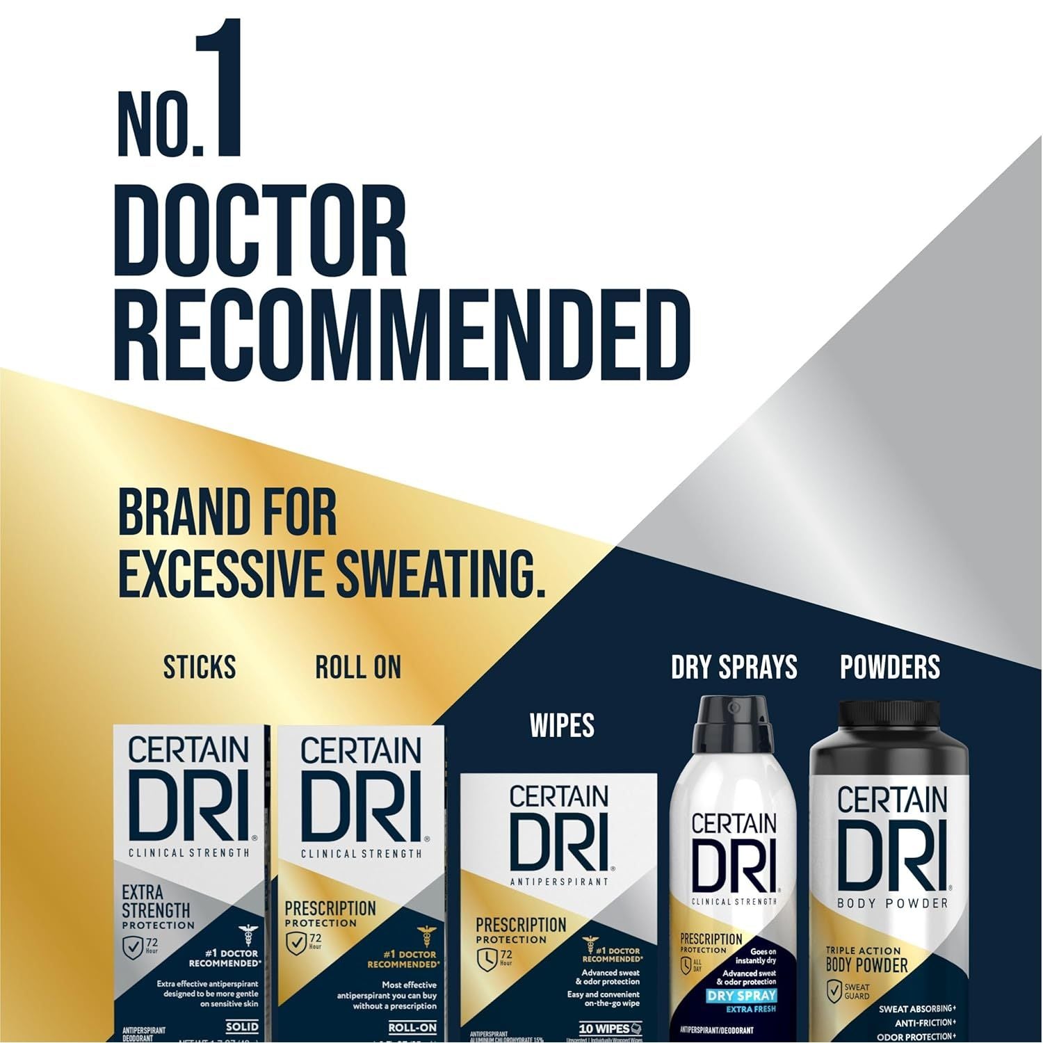 Certain Dri is the #1 over-the-counter brand that doctors recommend for their patients with excessive sweating, & is one of the original clinical antiperspirant brands. Certain Dri offers t3 levels of protection to help sufferers manage their excessive sweating. Certain Dri Prescription-Strength Clinical Antiperspirant contains 15% aluminum chloride & is one of the strongest, most effective antiperspirants you can buy without a prescription. Aluminum chloride is the strongest & most effective ingredient available & is the #1 doctor-recommended active ingredient for hyperhidrosis. This Certain Dri formulation stops excessive sweating for up to 72 hours. Please note - this item is intended for people with the medical condition hyperhidrosis so it contains a strong active ingredient that may irritate the skin when applied incorrectly. It's important to apply sparingly at nighttime only to completely dry underarms. Don't use immediately after showering, shaving, or on broken & irritated skin.