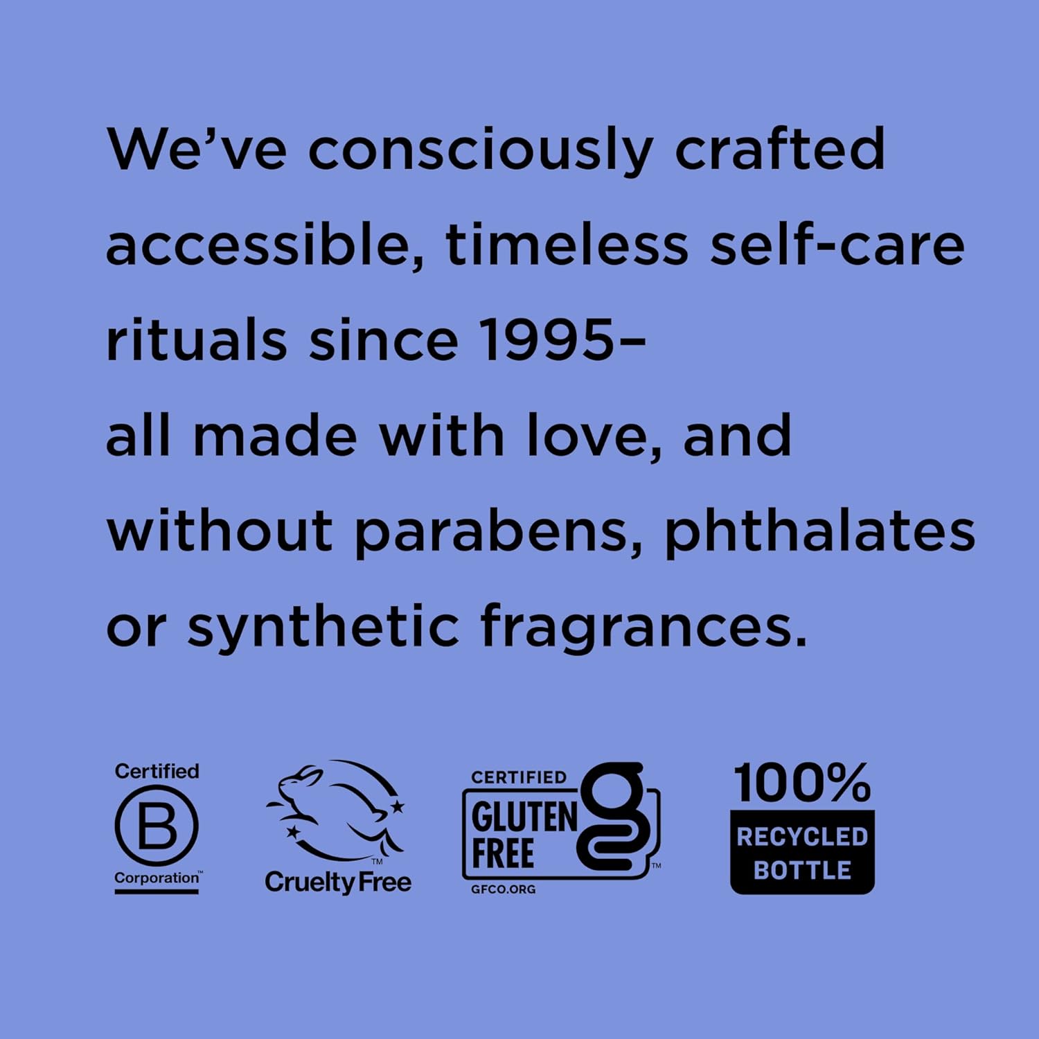 Moisturizing botanical extracts and gentle coconut cleanser caress your skin as you sink into a perfect bath. Soothing lavender pure essential oil helps create a sense of calm. EO stands for essential oils. They're the heart and soul of all our scents, which enhance your life, one breath at a time. We've consciously crafted accessible, timeless self-care rituals since 1995-all made with love, and without parabens, phthalates, GMOs or synthetic fragrances.