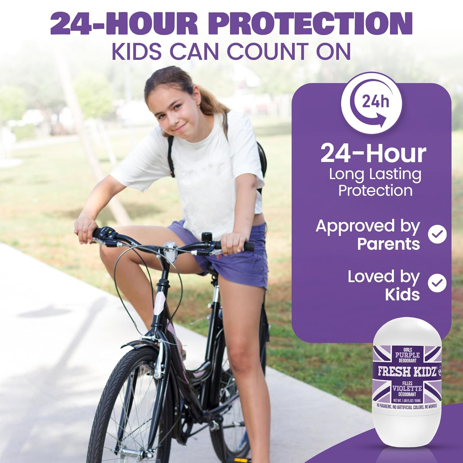 - Fresh Kidz Roll On Deodorant for Kids and Teens - Baking Soda and Aluminum-free 24 Hour Protection for Sensitive Skin - Girls "Purple" 1.86 fl.oz.