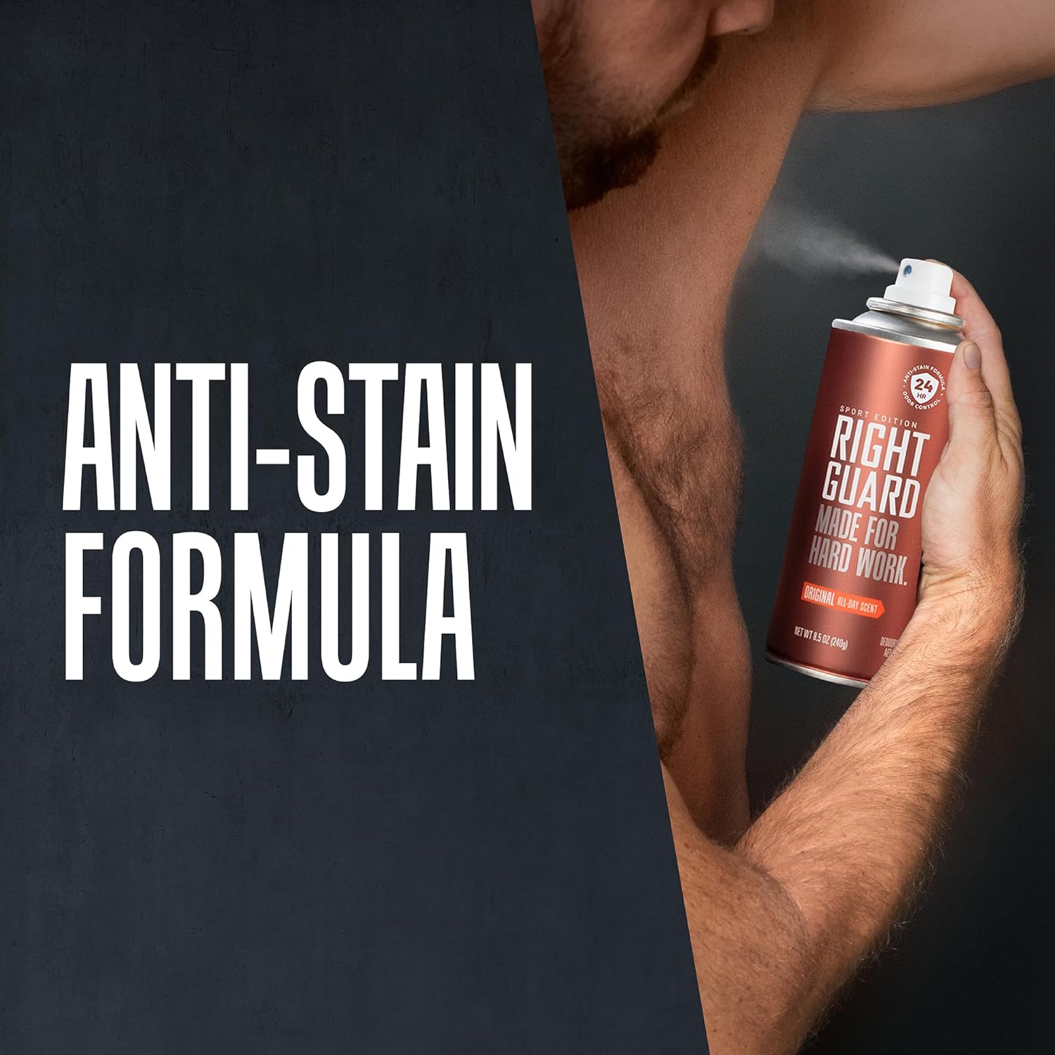 Stay protected, stay fresh, and stay focused with Right Guard Sport Original Scent Deodorant Spray. Made for men who hustle hard and never slow down, this aluminum-free spray deodorant delivers serious performance with a clean, masculine scent that lasts. Whether you’re working a double shift or handling business off the clock, Right Guard is the deodorant men trust to get the job done. With 24-hour odor control, our Original scent keeps you feeling fresh and smelling clean all day. The anti-stain formula goes on clear to help protect your uniforms, work shirts, or favorite tee from white marks—so you look as sharp as you feel. The quick-drying spray makes application fast and hassle-free. No residue, no sticky feeling—just instant protection in one simple spray. With over 60 years under our toolbelt, Right Guard continues to deliver the strength, reliability, and innovation men count on. Every can in this 8.5 oz, 2-pack is built for long-lasting use, giving you reliable protection whenever you need it. Just grab, spray, and get after it—because you don’t take days off, and neither should your deodorant.