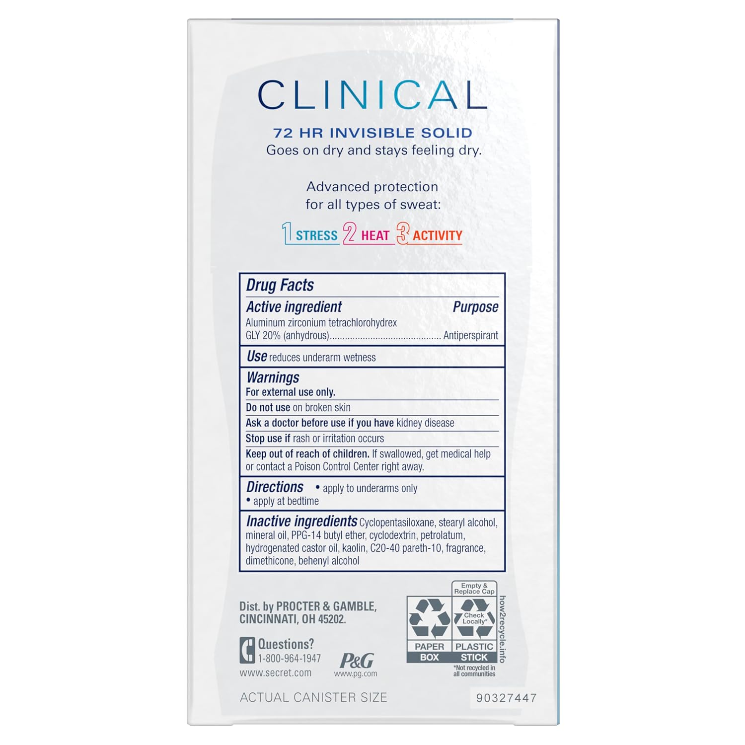 Secret Clinical Strength Antiperspirant and Deodorant for Women is clinically proven protection for 3 types of sweat; 1) stress sweat, 2) heat sweat and 3) activity sweat. This invisible solid gives you 72-hour sweat and odor protection, you can confidently go about your day, knowing you're safeguarded against sweat and odor, no matter the circumstance