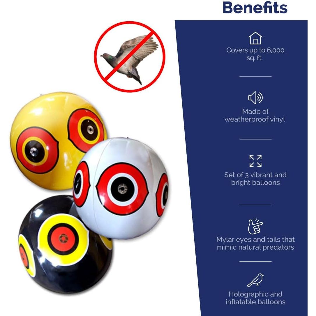 - Bird-X Scare-Eye Balloons, Predator 3D Eye Balloons with Glaring, Bright Colors, Cover up to 6,000 sq. ft. Area, Pack of 3, Yellow, White, and Black