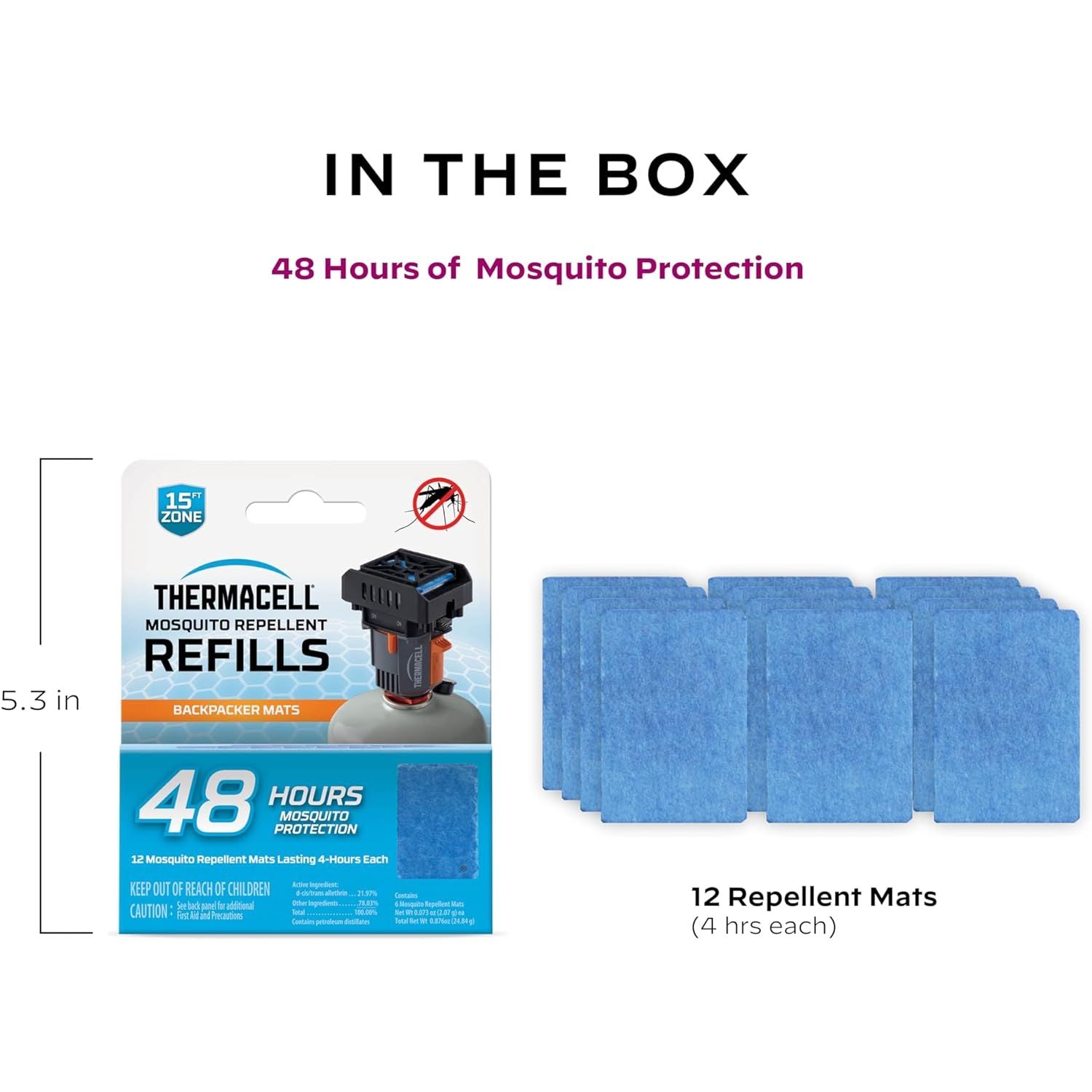 - MOSQUITO PROTECTION THAT WORKS: Thermacell effectively keeps mosquitoes up to 15FT away. Works fast, get max protection in 15 minutes. Easy to use. This 48-hour mat-only refill pack is for use in the Thermacell Backpacker Mosquito Repeller only.