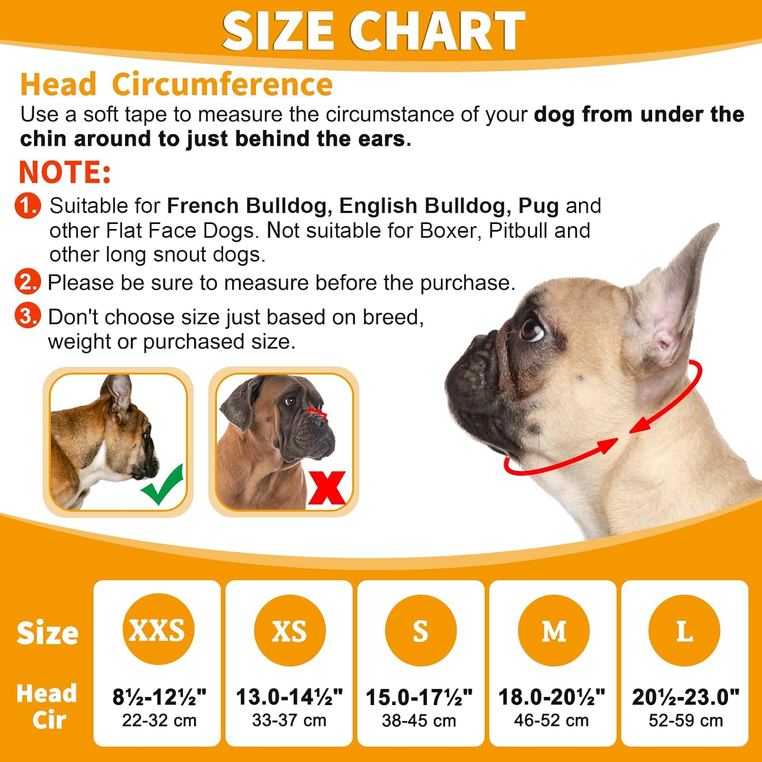- Size XS Pug Muzzle (head cir 13.0-14.5''): Please measure your dog's head circumference before buying. Size XS is suitable for small flat face dogs such as Pug, 6-12 months French Bulldog, etc. Wrap a soft measuring tape around the circumference of your dog's head from the chin to the behind of the ears. Each package includes detailed instructions—please read them carefully before use. Never leave a muzzled dog unattended as prolonged use or improperly fitted muzzles can affect a dog's panting