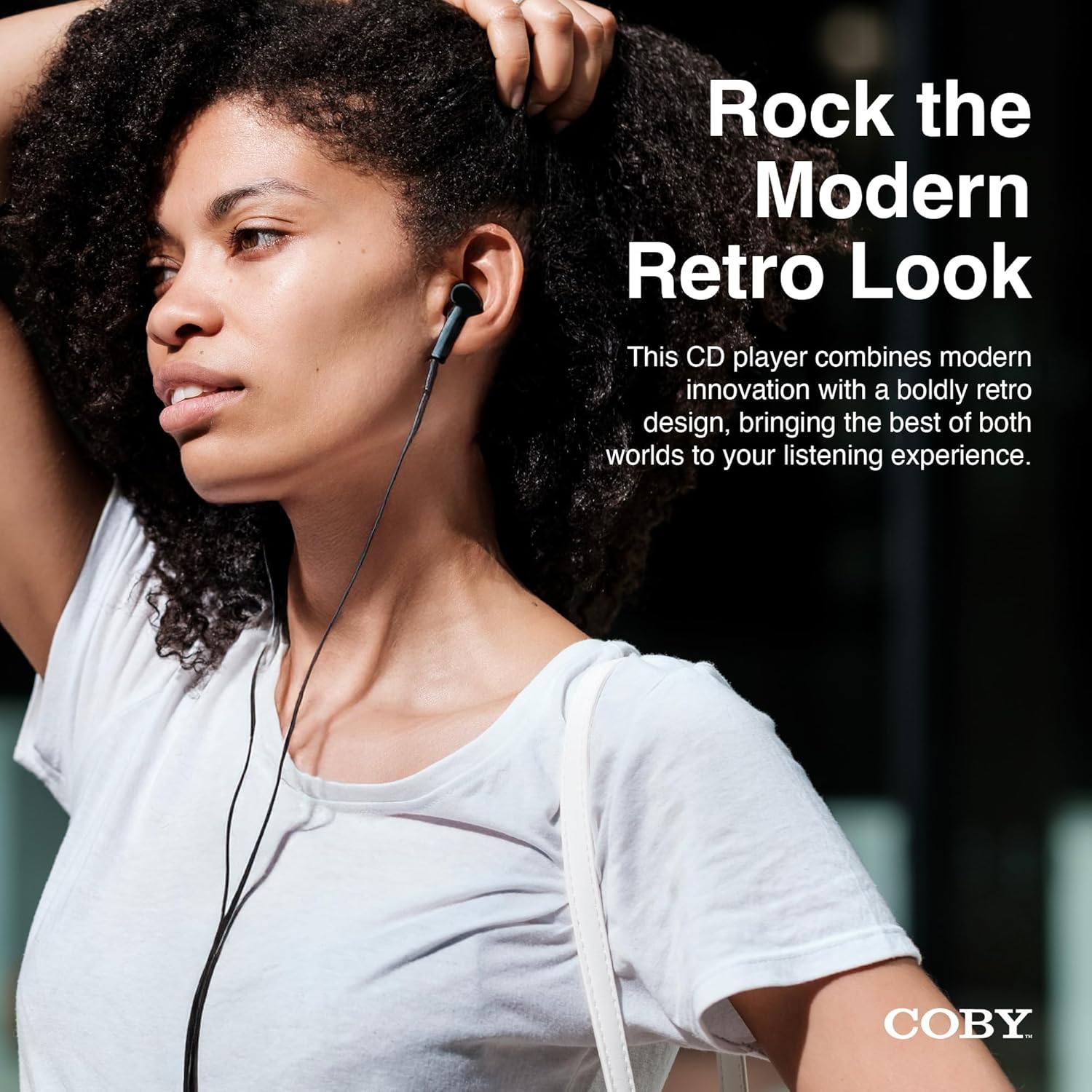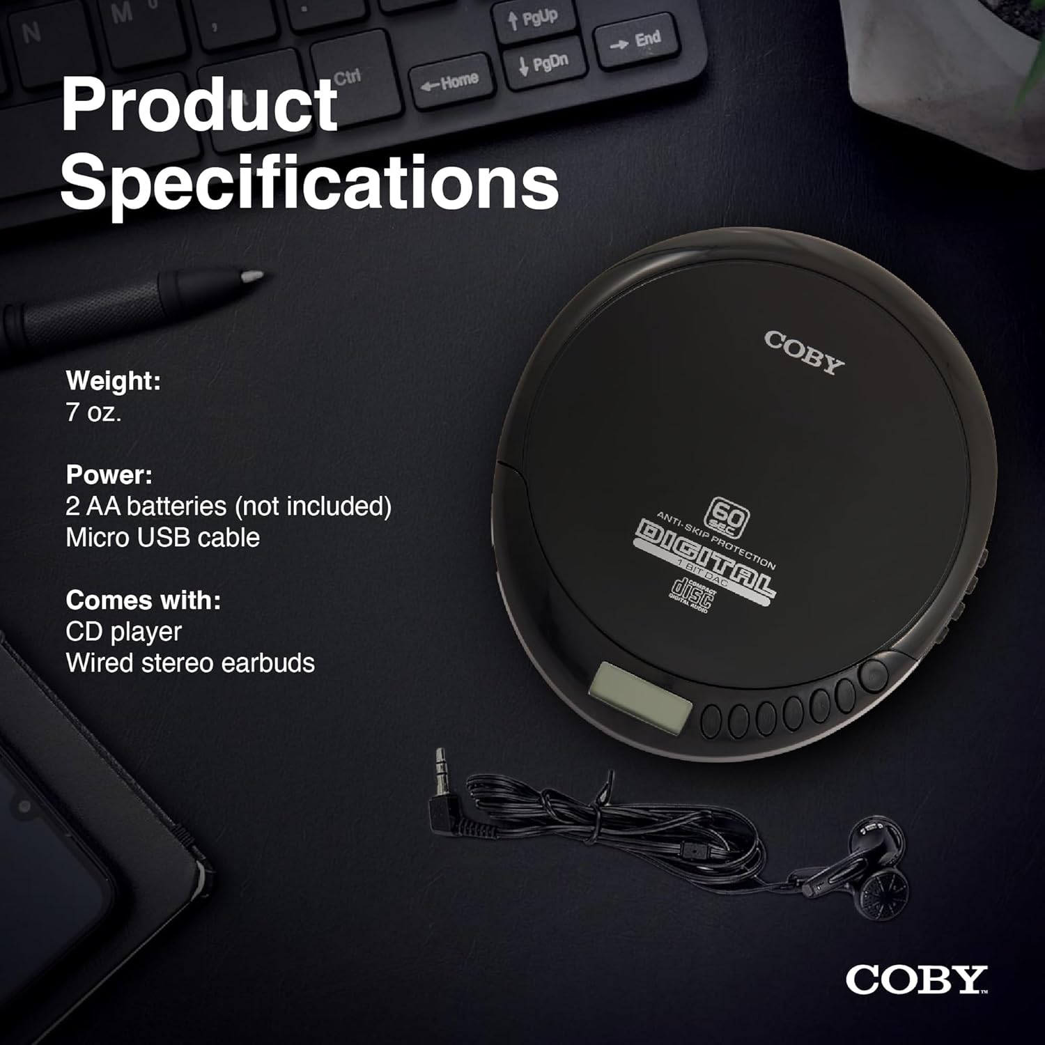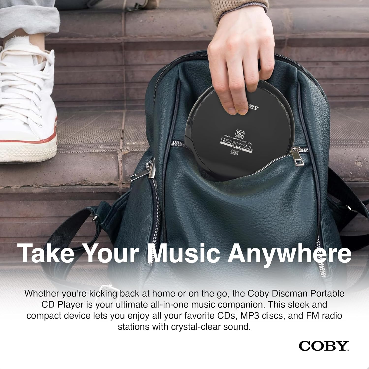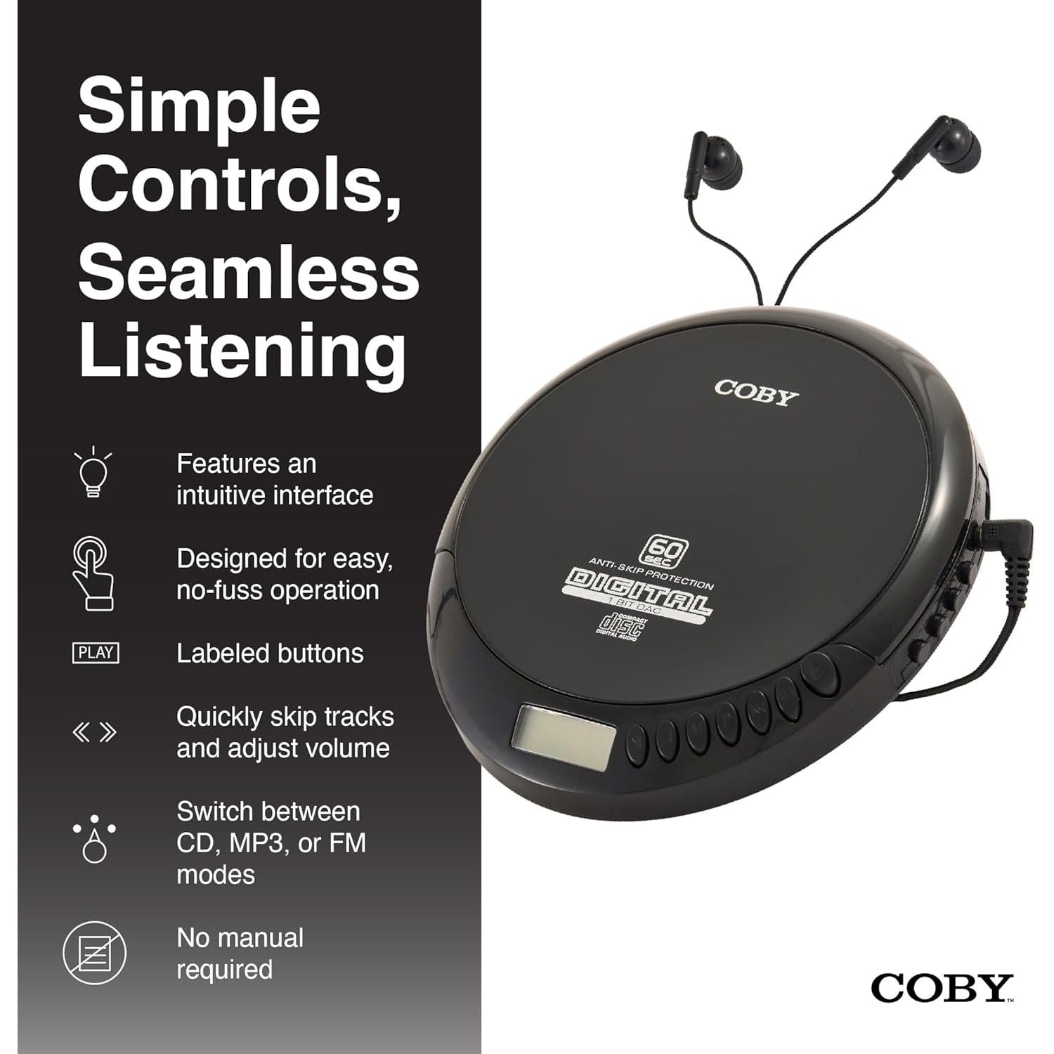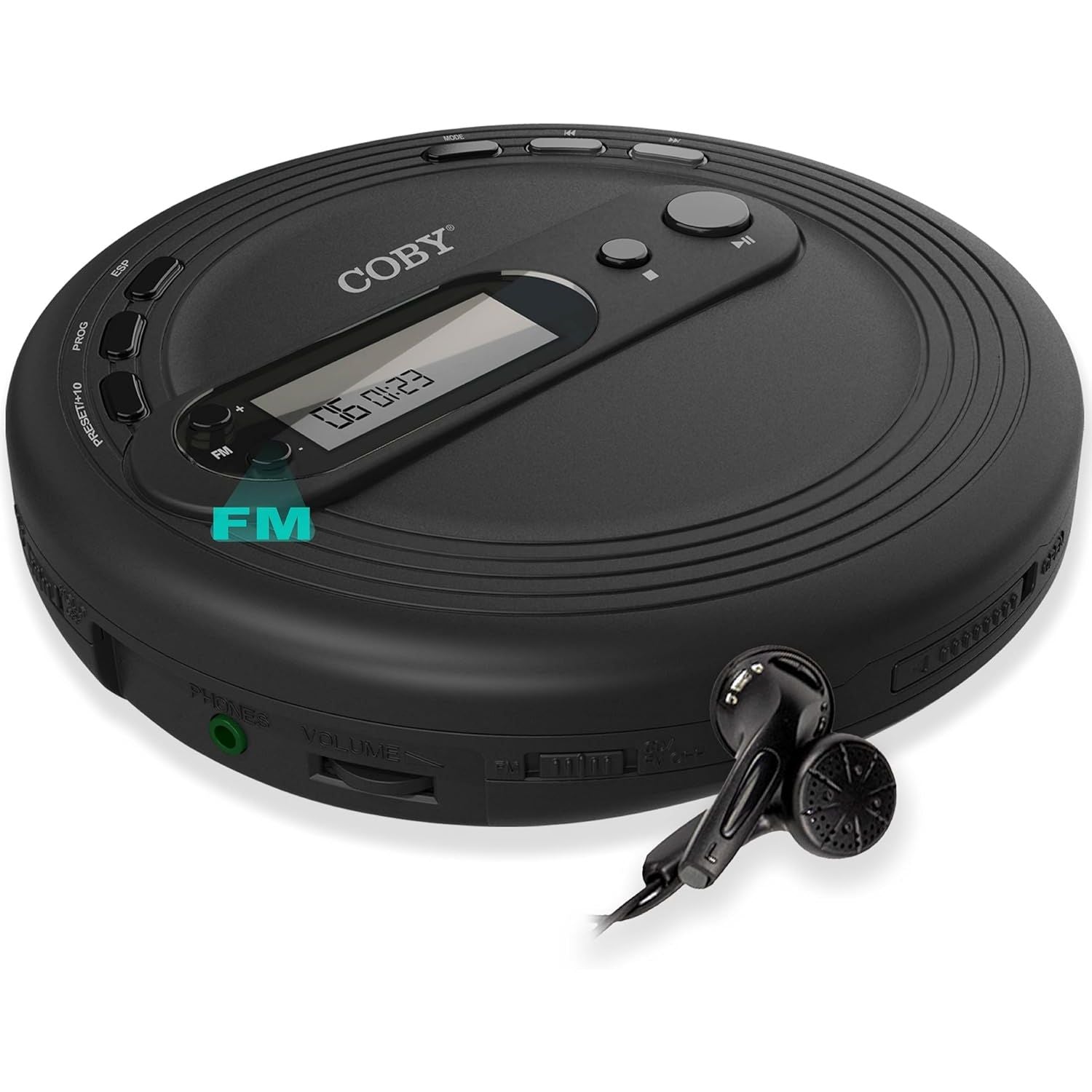 - Coby Portable CD Player with Headphones, FM Radio and MP3 Compatible, LCD Display, 60-Second Anti-Skip Protection, Shockproof Design for Easy Travel, Includes Micro USB Cable for Charging