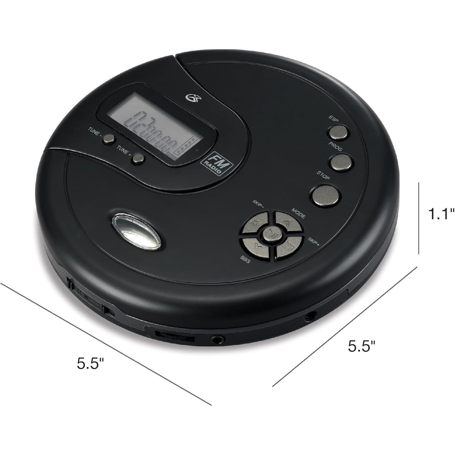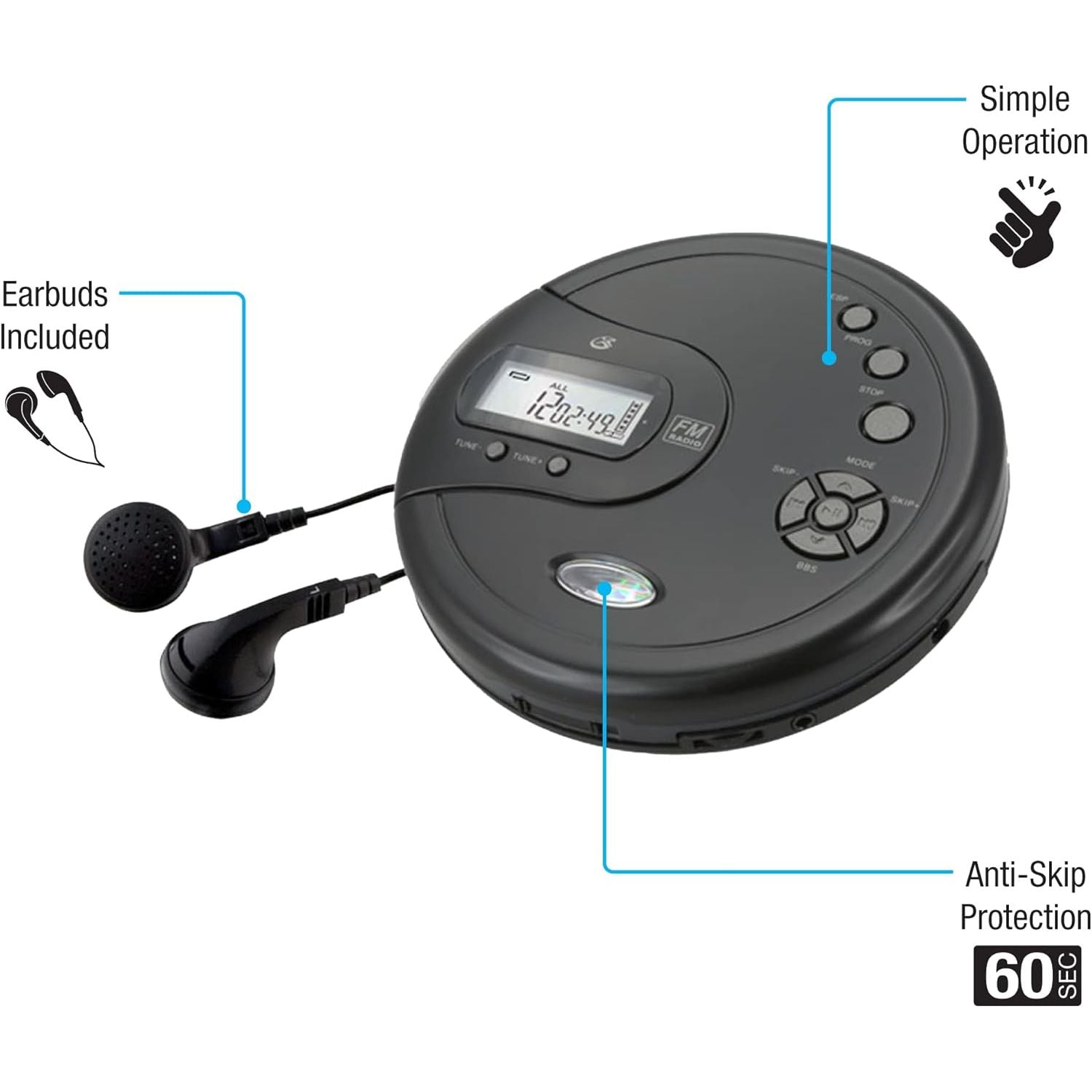 Listen to your favorite CDs or FM radio stations on the go with the GPX Portable FM Radio and CD Player. This portable player features 60-second skip protection, programmable tracks, an LCD display, and low battery indicator. Stereo earbuds are included to give you maximum listening enjoyment. Requires 2 AA batteries (not included). Black.