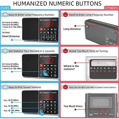 - ♥【BLUETOOTH & HANDS-FREE】The bluetooth radio is equipped with upgraded 4.0 bluetooth technology, greatly enhance the transmission speed, and re-connect to the paired device automaticly, also be used as a hands-free telephone receiver, no worries about missing any important calls when enjoying a soothing moment with the bluetooth radio. NOTES: Bluetooth headphones not supported.