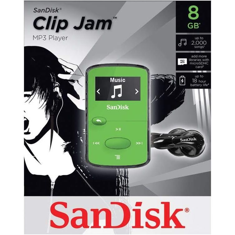 - SanDisk 8GB Clip Jam MP3 Player, Green - microSD card slot and FM Radio - SDMX26-008G-G46G
