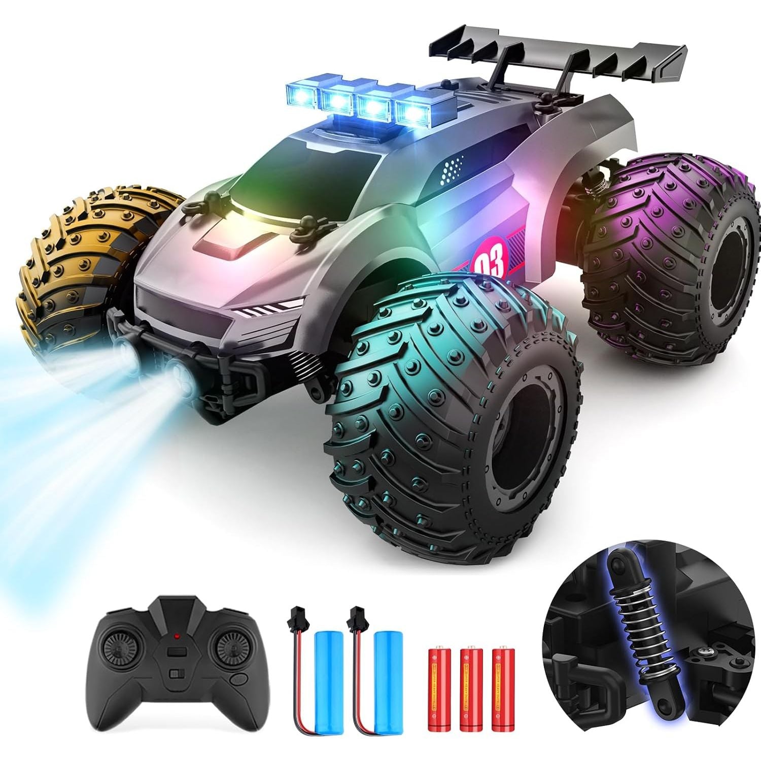 - Premium Quality & Durable: This RC truck is made of strong, lightweight ABS material with a durable driveshaft, sturdy gear differential and classic ball bearings. This RC monster truck comes with bright LED headlights and headlamps to illuminate the road ahead during nighttime play.