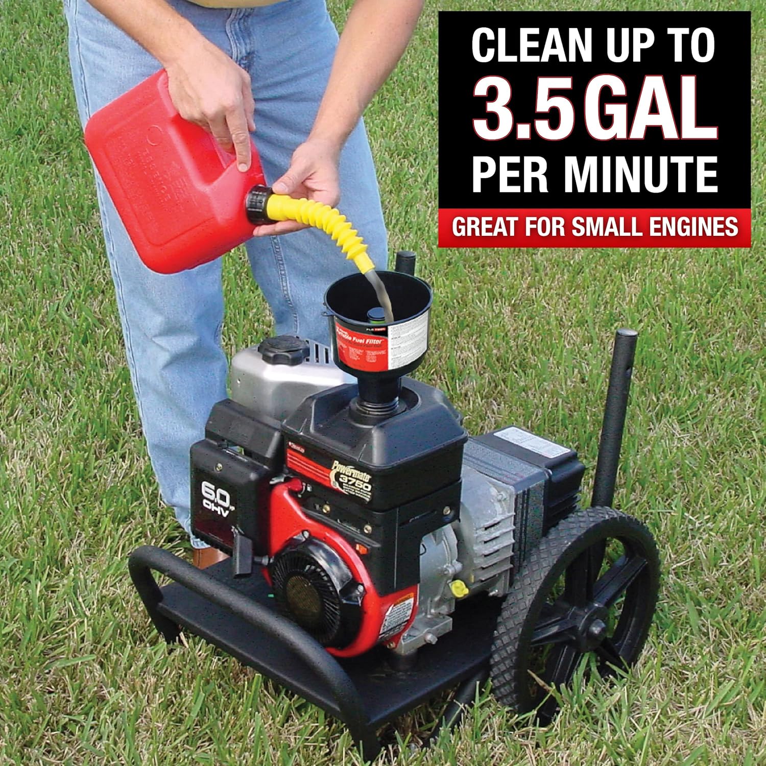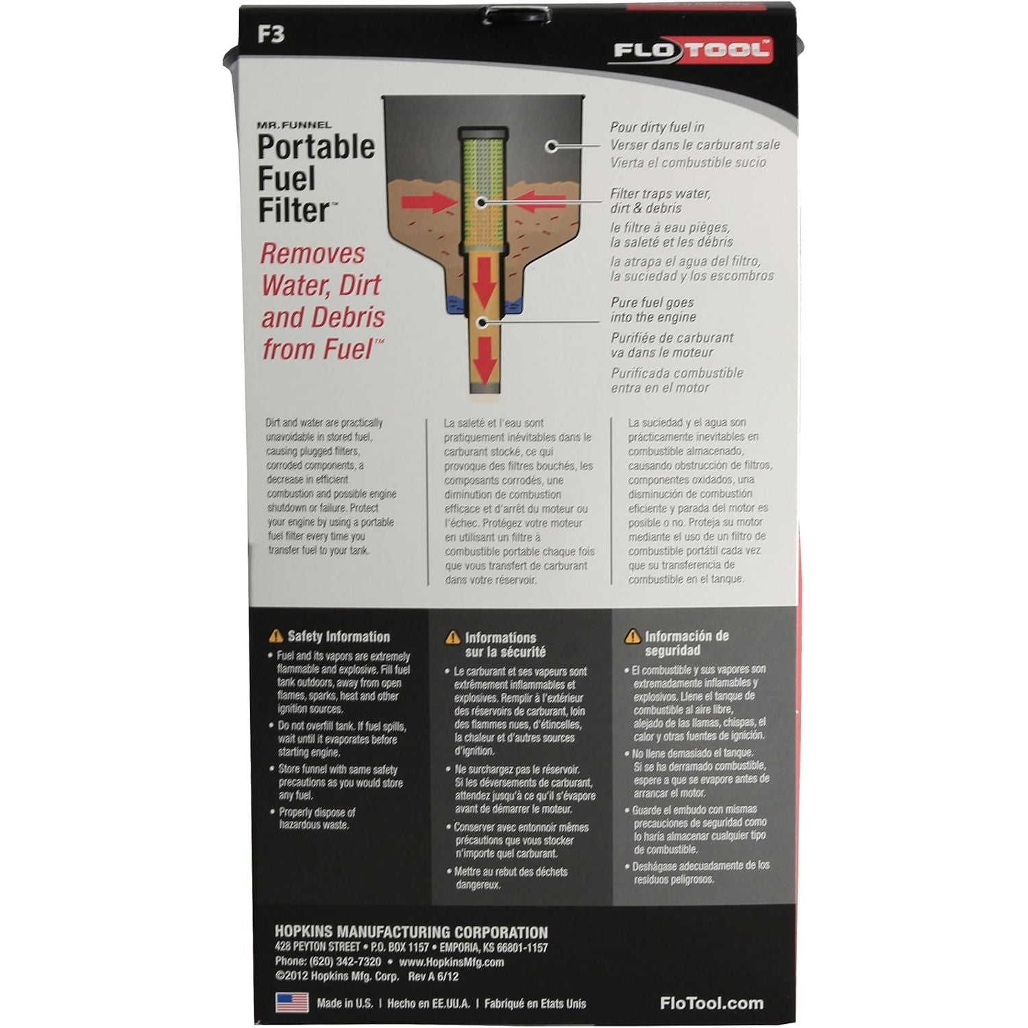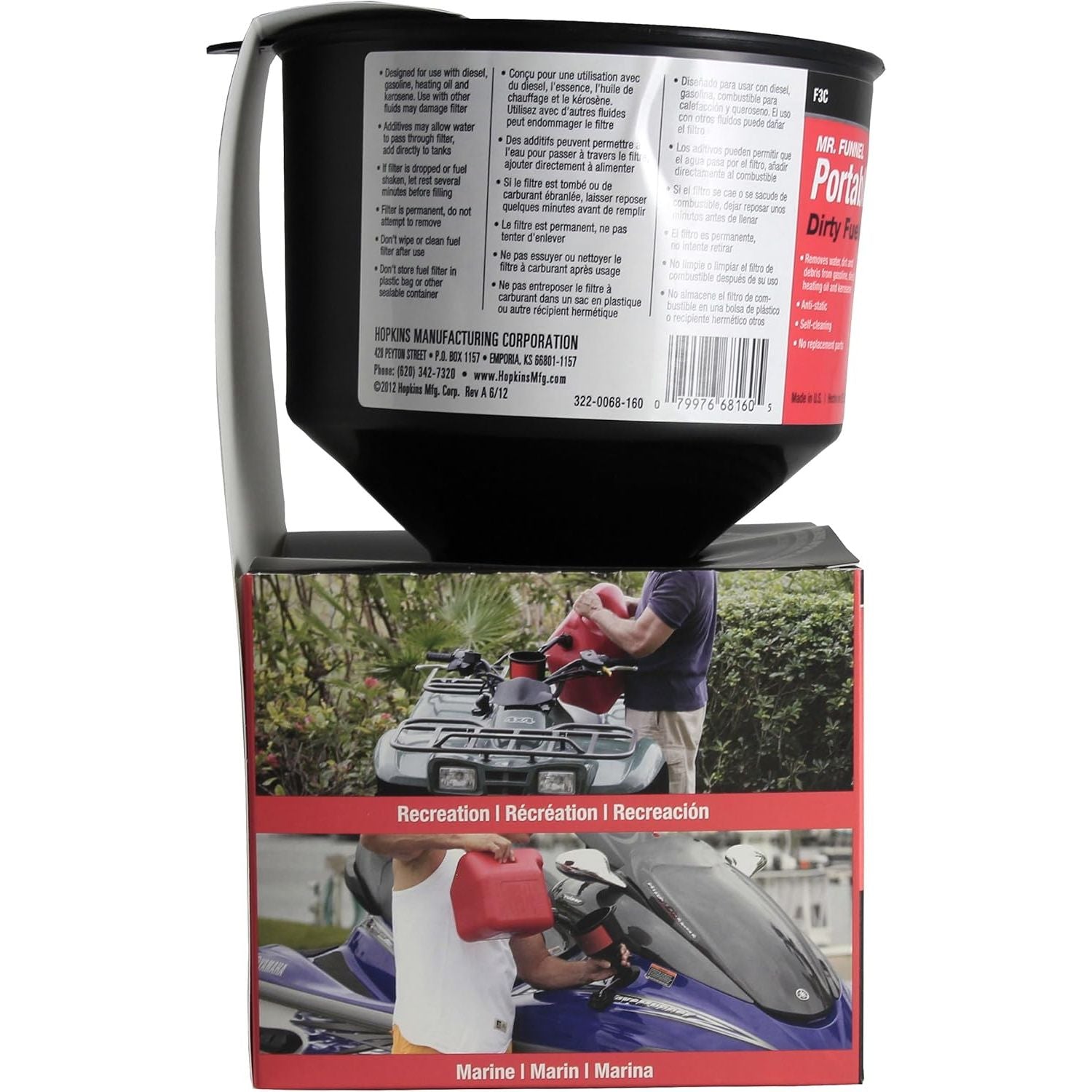 Product Description Product DescriptionFrom the ManufacturerThe Mr. Funnel Fuel Filter #F3C removes water, dirt, and debris from fuel. As fuel sits, it collects condensation, water and debris and one of the leading causes of engine failure is contaminated fuel. Use the Fuel Filter Funnel to protect equipment around the house or workplace including Lawnmowers, Pressure Washers, Generators, Gas Powered Tools, ATVs, Snowmobiles, etc. The Fuel Filter Funnel works with standard Gasoline, Diesel, Heating Oil, and Kerosene. It's Simple, Portable, and Self-Cleaning. Made from Industrial Grade Conductive Polypropylene.From the ManufacturerThe Mr. Funnel Fuel Filter #F3C removes water, dirt, and debris from fuel. As fuel sits, it collects condensation, water and debris and one of the leading causes of engine failure is contaminated fuel. Use the Fuel Filter Funnel to protect equipment around the house or workplace including Lawnmowers, Pressure Washers, Generators, Gas Powered Tools, ATVs, Snowmobiles, etc. The Fuel Filter Funnel works with standard Gasoline, Diesel, Heating Oil, and Kerosene. It's Simple, Portable, and Self-Cleaning. Made from Industrial Grade Conductive Polypropylene. From the Manufacturer The Mr. Funnel Fuel Filter #F3C removes water, dirt, and debris from fuel. As fuel sits, it collects condensation, water and debris and one of the leading causes of engine failure is contaminated fuel. Use the Fuel Filter Funnel to protect equipment around the house or workplace including Lawnmowers, Pressure Washers, Generators, Gas Powered Tools, ATVs, Snowmobiles, etc. The Fuel Filter Funnel works with standard Gasoline, Diesel, Heating Oil, and Kerosene. It's Simple, Portable, and Self-Cleaning. Made from Industrial Grade Conductive Polypropylene.