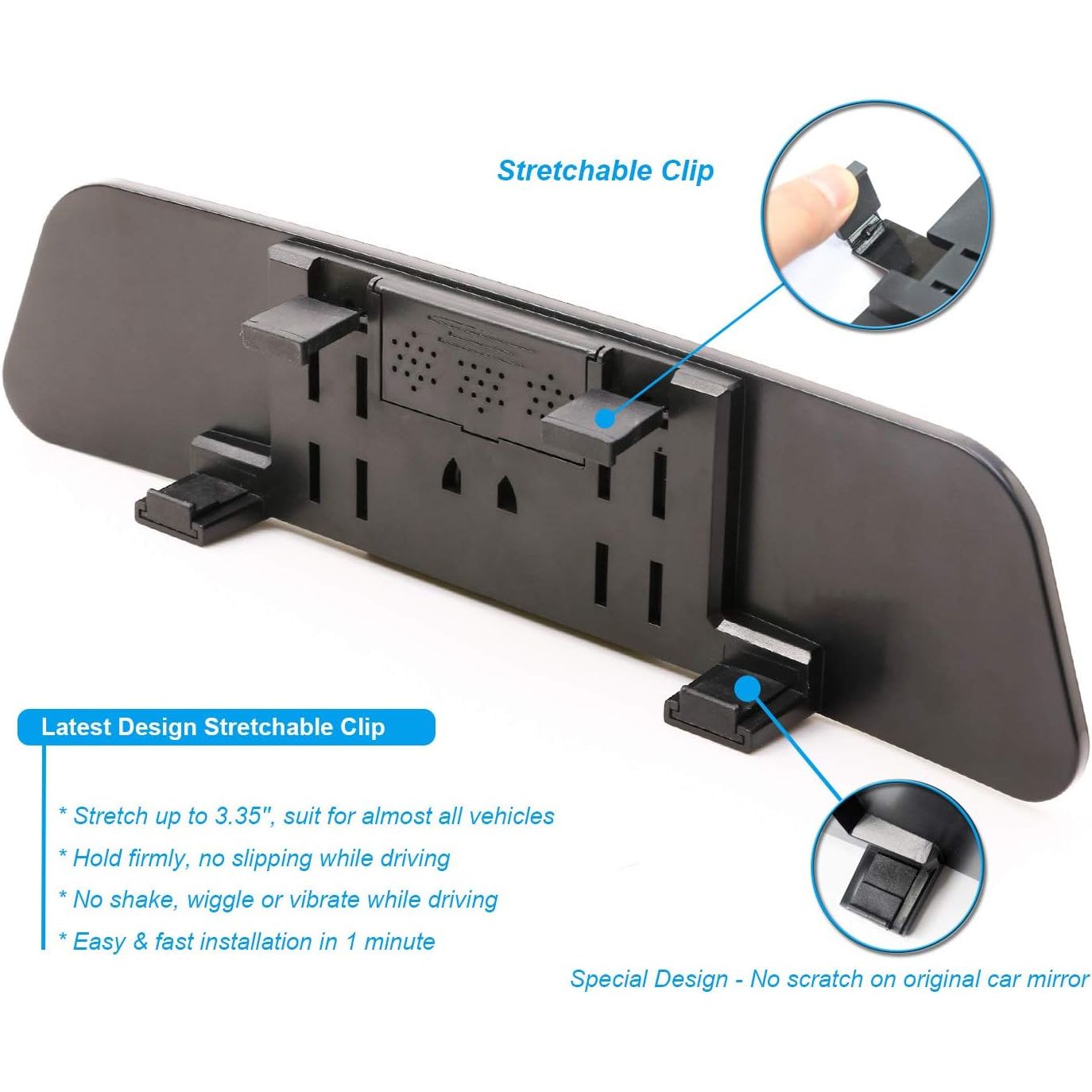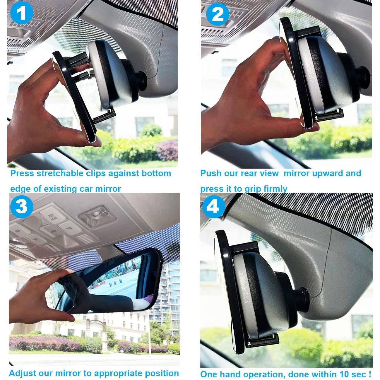 - 10 Seconds Tool-Free Installation - Attach securely to any car mirror with adjustable clips —no drilling or adhesives required. Compatible with 99% of vehicles and easily removable for transfer. You just need to clip this panoramic rear view mirror onto the existing rearview mirror tightly, adjust the angle and finish!