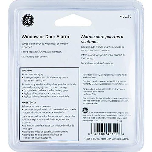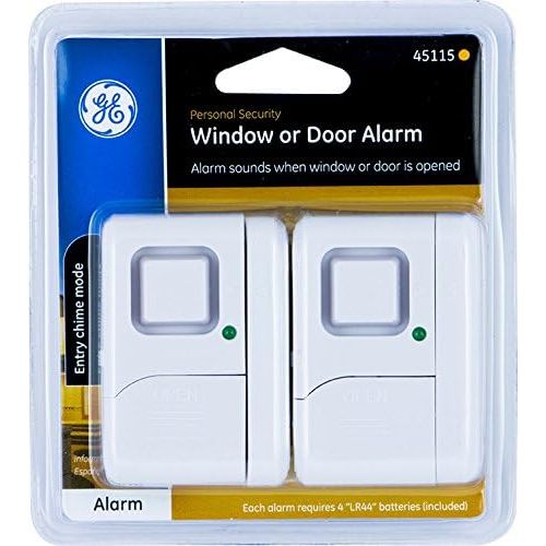 Product Description The GE-branded UltraPro Window and Door Alarms provide a simple-to-use, cost-effective security solution to protect against home invasions. The 120-decibel alarms are loud enough to make a would-be intruder think twice about entering through your doors or windows. Each alarm features an easy-access chime/OFF/alarm switch. The straightforward design makes your security setup intuitive and streamlined. With no wires required for installation, protecting an entry point is as easy as mounting the alarm using the included double-sided tape. When a door or window is opened the alarm’s base becomes separated from its magnet, triggering a gentle chime or ringing alarm. It’s even great for alerting you when other indoor areas, like cabinets and drawers, are accessed. Powered by four included LR44 batteries, the LED indicator on the front will notify you when power is low. This set of GE-branded UltraPro Personal Security Window and Door Alarms are perfect for homes, apartments, dorm rooms, offices, RVs, campers and much more. From the Manufacturer The GE Personal Security Window/Door Alarm provides a simple-to-use, cost-effective security solution to protect you and your family against home invasions thanks to the 120-decibel alarms, loud enough to make a would-be intruder think twice about entering through your doors or windows. The alarm is also extremely easy to use. The window/door alarms feature a contemporary design with easy access buttons and controls for simple operation. This straightforward concept makes using the GE Personal Security Window/Door Alarm intuitive, no matter what your technological skills may be. Perfect for homes, apartments, dorm rooms and offices.