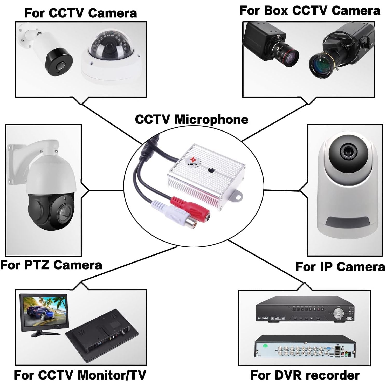 This security microphone for CCTV security camera which did not included the microphone, like Hikvision/ Dahua/ Amcrest/ Foscam/ Dericam AHD/HDCVI/HDTVI/960H CCTV Camera, DVR, VCR, TV, WiFi IP Camera and low-frequency amplifiers.