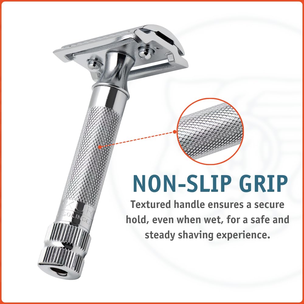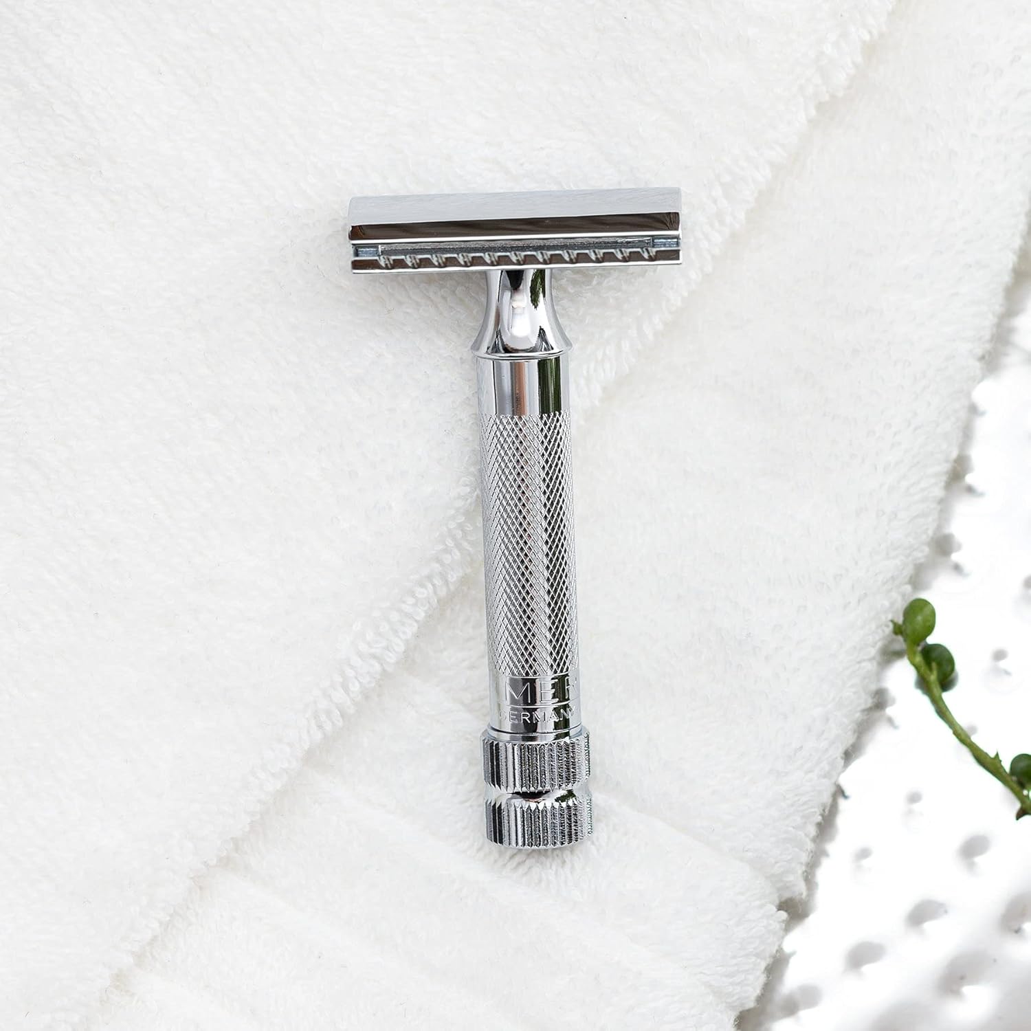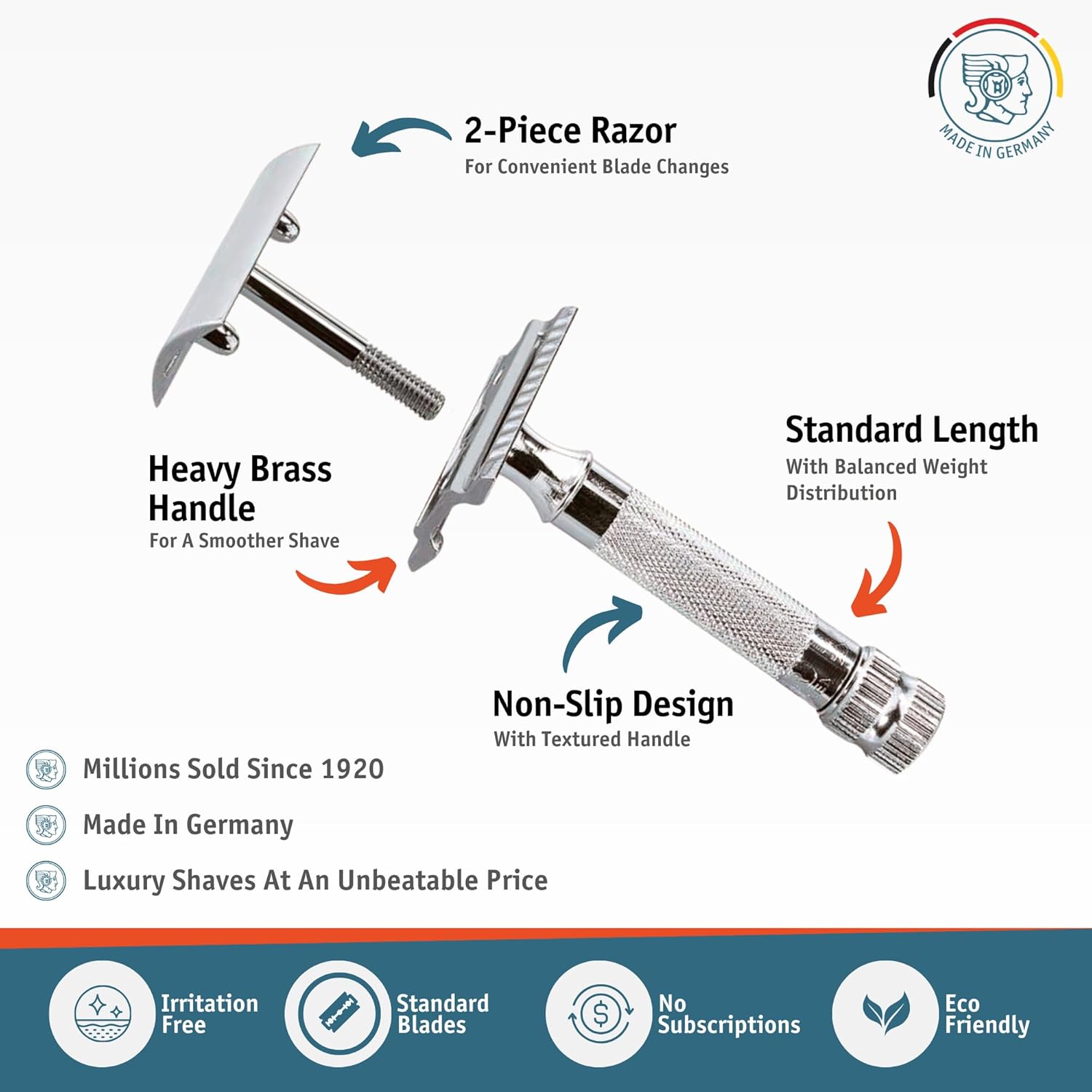 MERKUR Stainless-Steel Super-Platinum double-edge razor blades. Each individual package is sealed and contains 10 blades. Each blade is individually wax-paper wrapped. Works with MERKUR and standard double-edge safety razors.