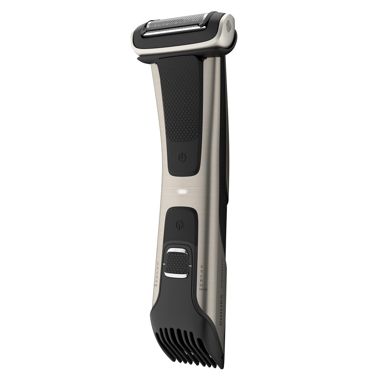 Now you can confidently trim and shave everywhere below the neck with just one tool. Use the Bodygroom 7000 Series full body trimmer and shaver to trim with one single attachment, for an even result on your intimate areas, shoulders, chest, abs, underarms, arms and legs. With its unique double grooming heads and advanced safety technology, this hair trimmer for men lets you confidently switch between shaving and trimming. Achieve precise results anywhere on your body with the contour-following 4D shaver and 5-length trimmer. Enjoy a natural look or closer result thanks to a 5-length adjustable comb. The skin-friendly shaver head trims longer hair first and then the hypo-allergenic foil shaves it off completely. This provides close results while protecting your skin from nicks and cuts. The steel blades lightly brush against one another, sharpening themselves as they trim so they stay extra sharp and effective. Refresh your foil every year for optimal results. Your wet and dry body groomer is fully waterproof, so you can use it in or out of the shower and clean it easily. For best results, use on dry hair before showering. Easy to hold and maneuver, with a rubber ergonomic grip for more control, even in tough-to-reach areas. This groomer is equipped with a high-power rechargeable battery for full-body use, with 80 minutes of cordless use. When the battery light indicates low power status, you can use the appliance again after a 1-hour charge. Never needs to be oiled.