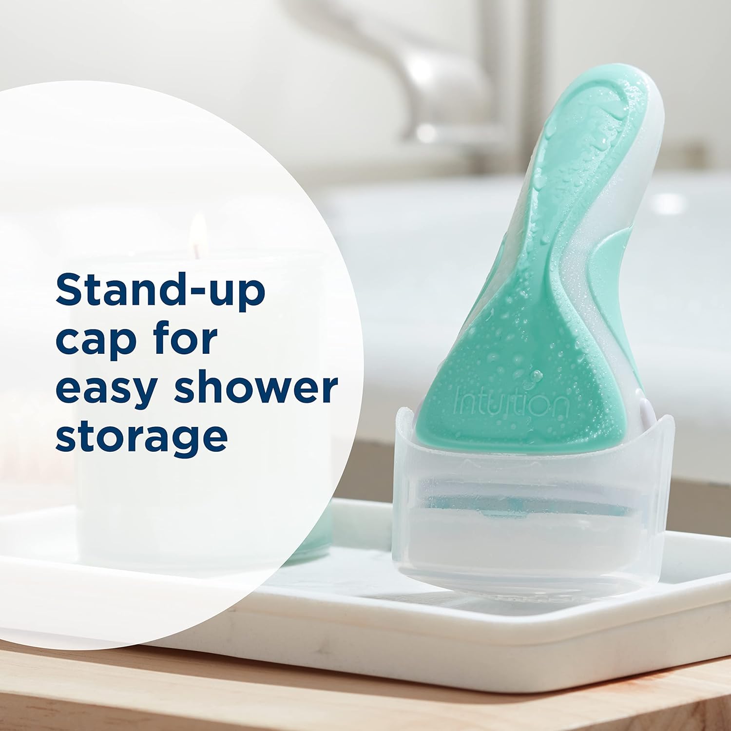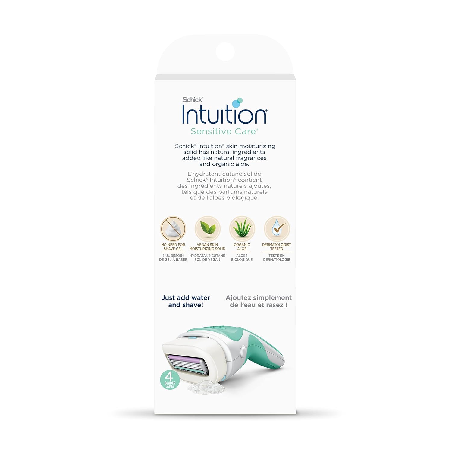The Schick Intuition Sensitive Care women’s razor lathers and shaves in one easy step, with no need for shave gel! Our sensitive skin razor features a built-in moisturizing bar made with natural fragrances and organic aloe. The gentle Sensitive Care formula is dermatologist tested, vegan and hypoallergenic, making it great for sensitive skin. Intuition’s smooth-gliding 4-blade cartridge has a pivoting head to hug the contours of your legs and body. A stand-up cap is included for easy shower storage. Plus, the Schick Intuition Razor is perfect for first-time shavers, minimizing nicks and cuts.